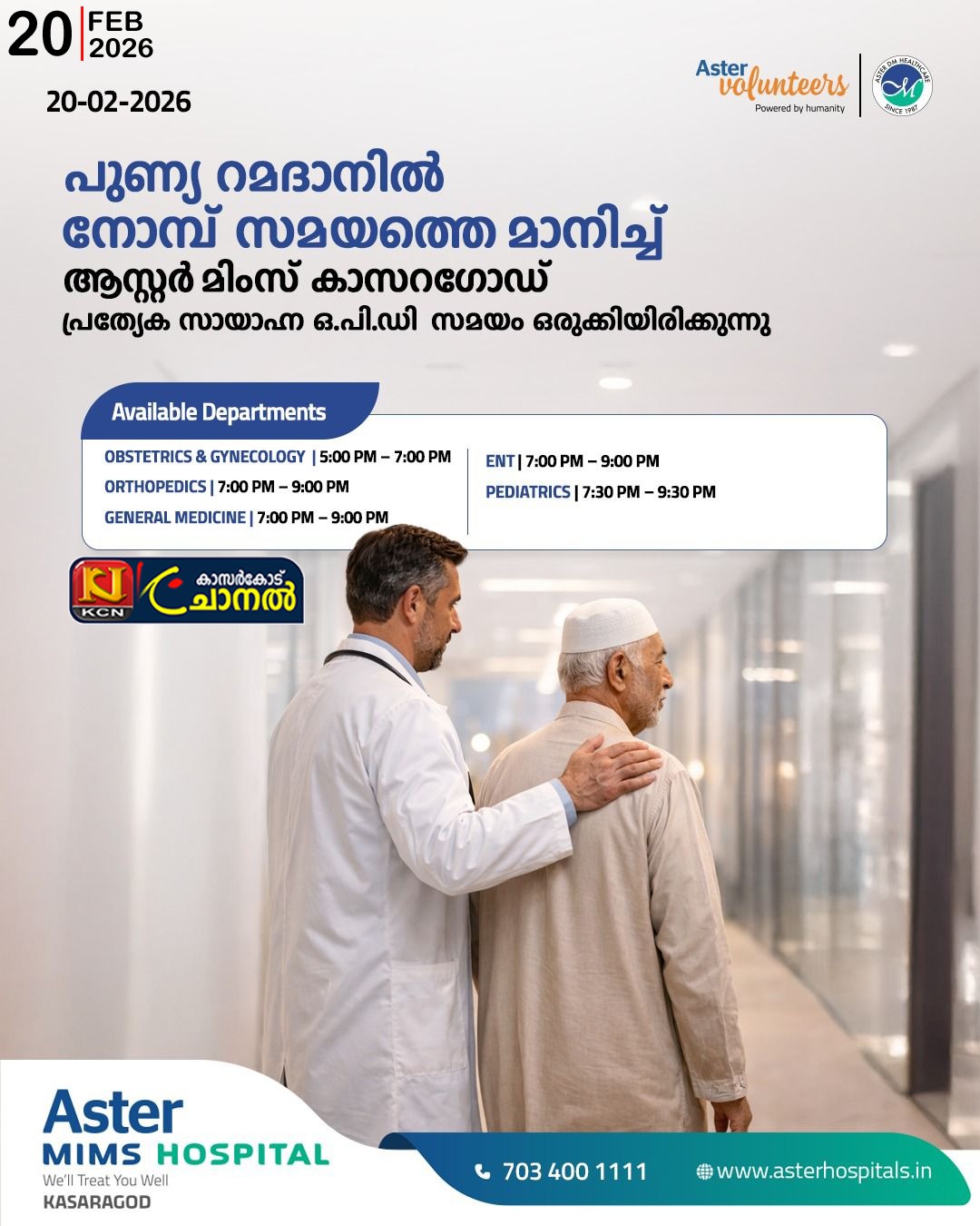 പുണ്യ റമദാനില് നോമ്പ് സമയത്തെ മാനിച്ച് ആസ്റ്റര് മിംസ് കാസര്ഗോഡ് പ്രത്യേക സായാഹ്ന ഓ പി ഡി സമയം ഒരുക്കിയിരിക്കുന്നുBy kcnchannel / February 20, 2026 Available Departments OBSTETRICS & GYNAECHOLOGY – 5:00 PM to 7:00 PM ORTHOPEDICS – 7:00PM to 9:00 PM GENERAL MEDICINE -7:00 PM to 9:00 PM ENT – 7:00 PM to 9:00 PM PEDIATRICS – 7:30 PM to 9:30 PM