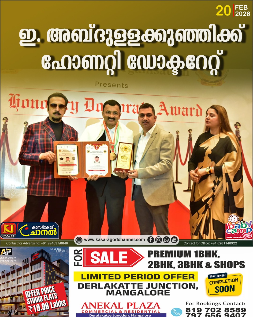 കാസര്കോട്: ഡല്ഹി ആസ്ഥാനമായുള്ള വേള്ഡ് കള്ച്ചറല് ആന്ഡ് എജ്യുക്കേഷണല് ഓര്ഗനൈസേഷന്റെ ഹോണററി ഡോക്ടറേറ്റിന് ഇ. അബ്ദുള്ളക്കുഞ്ഞി അര്ഹനായി. വിദ്യാഭ്യാസ, സാമൂഹിക മേഖലയിലെ സേവന പ്രവര്ത്തനങ്ങള് പരിഗണിച്ചാണ് വി.സി.ഇ.ഒയുടെ ഹോണററി ഡോക്ടറേറ്റ് അവാര്ഡ്. ഡല്ഹിയില് നടന്ന ചടങ്ങില് ബോളിവുഡ് താരം ഗുല്ഷന് ഗ്രോവര് ഹോണററി ഡോക്ടറേറ്റ് ഇ. അബ്ദുള്ളക്കുഞ്ഞിക്ക് സമ്മാനിച്ചു.