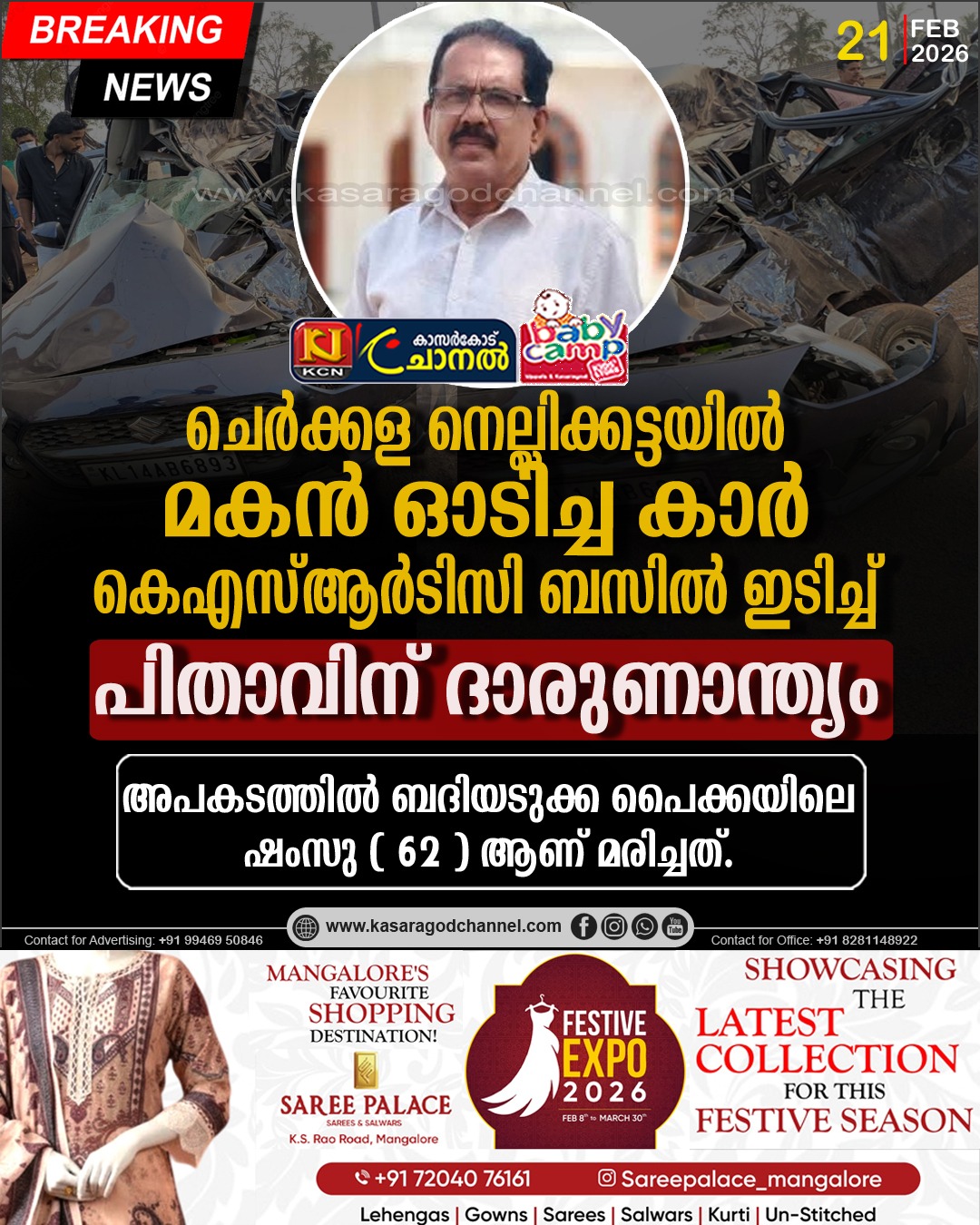 മരിച്ച ഷംസുവിന്റെ മകനാണ് കാര് ഓടിച്ചിരുന്നത്.മകന് ഗുരുതരമായി പരിക്കേറ്റു. അപകടത്തില് കാര് പൂര്ണമായും തകര്ന്നു.