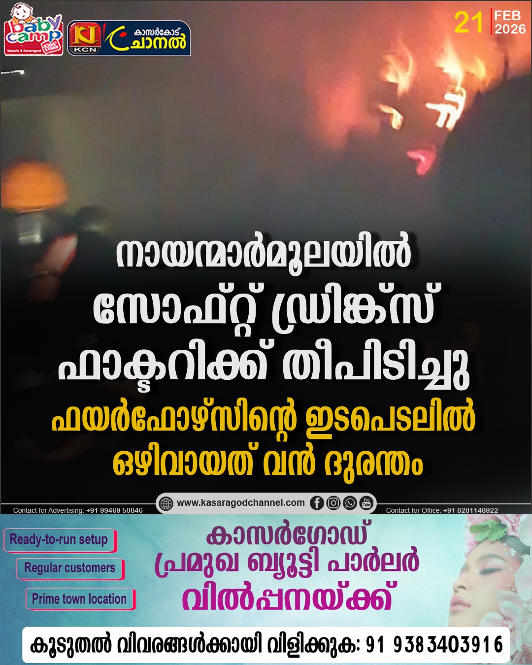 കാസര്ഗോഡ്: ചെങ്കള പഞ്ചായത്തിലെ നായന്മാര്മൂലയില് പ്രവര്ത്തിക്കുന്ന സോഫ്റ്റ് ഡ്രിങ്ക്സ് നിര്മ്മാണ യൂണിറ്റിലുണ്ടായ തീപിടുത്തം ഫയര്ഫോഴ്സിന്റെ സമയബന്ധിതമായ ഇടപെടലിലൂടെ നിയന്ത്രണവിധേയമാക്കി. ചെങ്കള മൂന്നാം വാര്ഡ് നായന്മാര്മൂലയിലെ ശ്രീ മുഹ്സിന് (കല്പക ഹൗസ്) എന്നയാളുടെ ഉടമസ്ഥതയിലുള്ള ‘ഫാക്കിയ സോഫ്റ്റ് ഡ്രിങ്ക്സ്’ എന്ന സ്ഥാപനത്തിനാണ് തീപിടിച്ചത്.