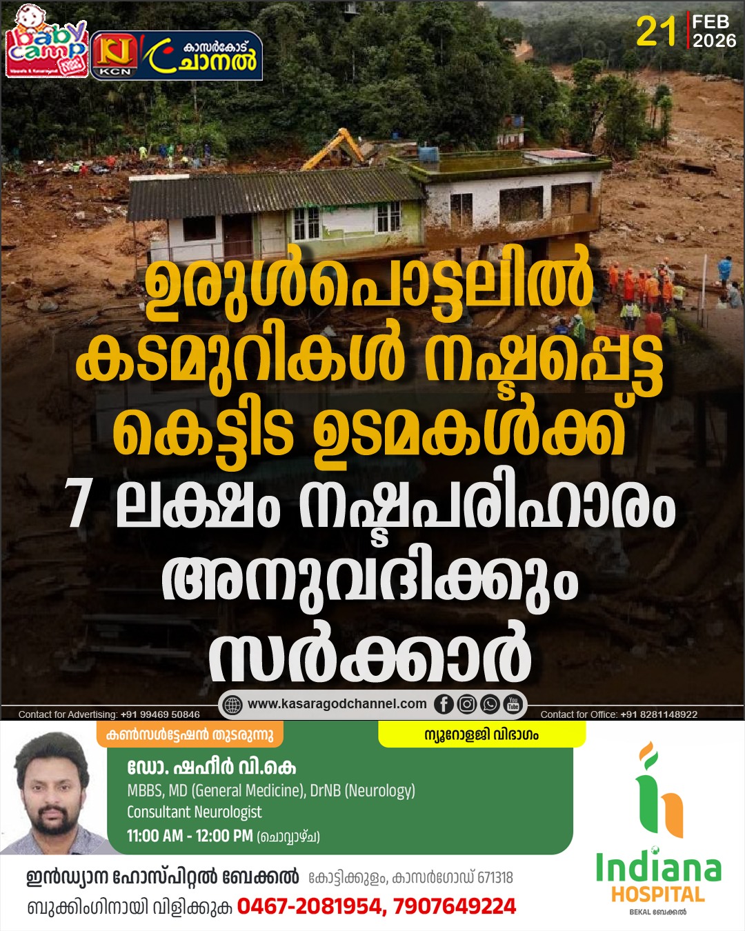 നാട് മേപ്പാടി ഉരുള്പൊട്ടലില് കടമുറികള് നഷ്ടപ്പെട്ട കെട്ടിട ഉടമകള്ക്കും സംരംഭകര്ക്കും ഉചിതമായ നഷ്ടപരിഹാരം അനുവദിക്കുമെന്ന് മന്ത്രി ഒ ആര് കേളു അറിയിച്ചു. ഇന്ന് ചേര്ന്ന മന്ത്രിസഭാ യോഗത്തിലാണ് ഇക്കാര്യം തീരുമാനിച്ചത്. ദുരന്തത്തില് പൂര്ണ്ണമായി നഷ്ടം സംഭവിച്ച കടകള്ക്ക് കടകളുടെ തരമോ ഘടനയോ പരിഗണിക്കാതെ ഒരു കടയ്ക്ക് ഏഴ് ലക്ഷം രൂപ നഷ്ടപരിഹാരം നല്കും.