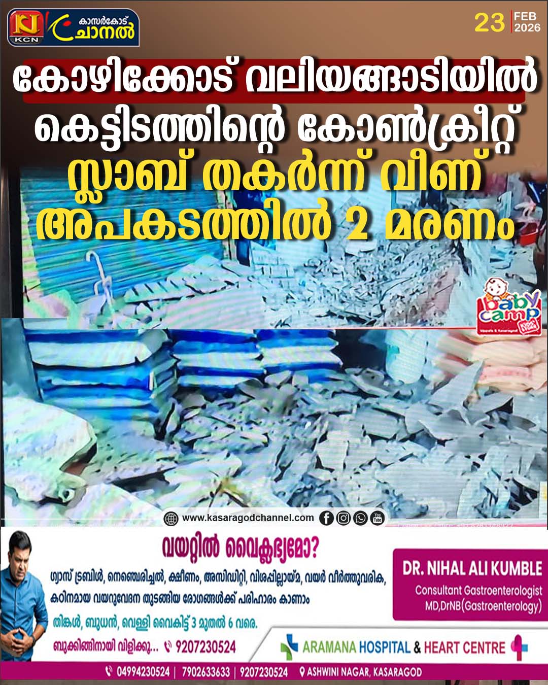 കോഴിക്കോട് വലിയങ്ങാടിയില് കെട്ടിടത്തിന്റെ കോണ്ക്രീറ്റ് സ്ലാബ് തകര്ന്ന് വീണ് അപകടത്തില് 2 മരണംBy kcnchannel / February 23, 2026 ബീച്ചിലെ പഴയ പാസ്പോര്ട്ട് ഓഫീസ് കെട്ടിടമാണ് തകര്ന്നുവീണത്.