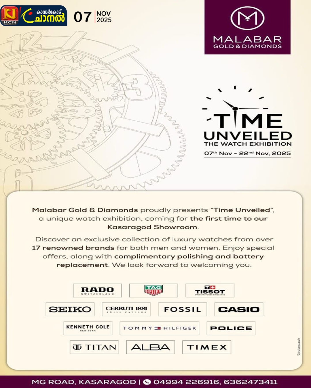 Tag Heuer, Rado, Longines, Tissot, Seiko, Fossil, Casio, Kenneth Cole, Tommy Hilfiger, Police, Alba , Titan , Timex തുടങ്ങിയ പ്രീമിയം വാച്ചുകളുടെ എക്സ്ക്ലൂസീവ് കളക്ഷൻസ്