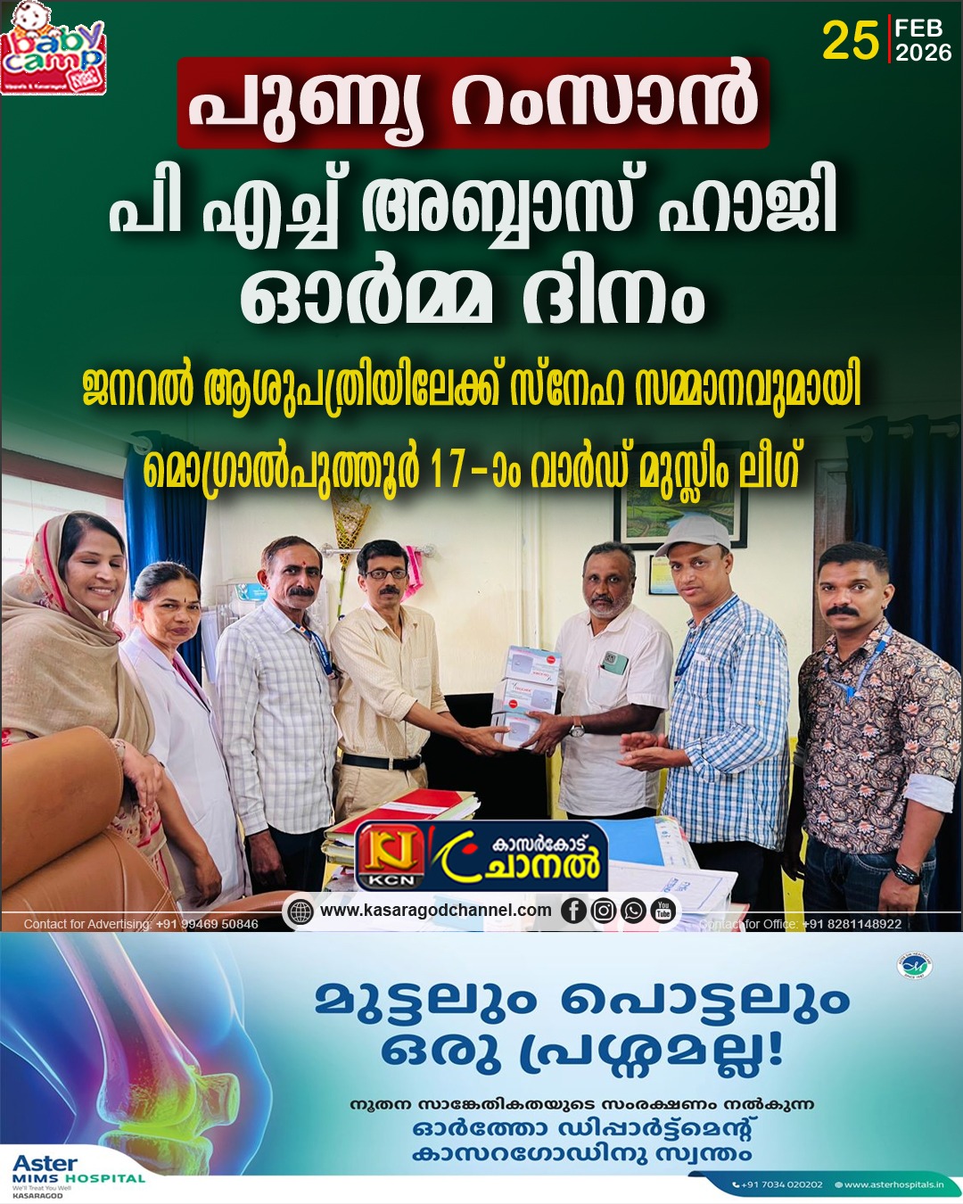 മൊഗ്രാല് പുത്തൂര് 17-ാം വാര്ഡ് മുസ്ലിം ലീഗ് കമ്മിറ്റിയുടെ നേതൃത്വത്തില് കാസര്കോട് ജനറല് ആശുപത്രിയിലേക്ക് അദ്ധേഹത്തിന്റെ ഓര്മ്മ ദിനത്തില് സഹായ ഉപകരണങ്ങള് സമ്മാനിച്ചു.പഞ്ചായത്ത് മുസ്ലിം ലീഗ് സെക്രട്ടറി കെ ബി അഷ്റഫില് നിന്നും സുപ്രണ്ട് ഡോ ശ്രീകുമാര് മുകുന്ദ് ഏറ്റുവാങ്ങി, ലേ സെക്രട്ടറി ബാലസുബ്രമണ്യ, ഡോ അരുണ് രാം, ഡോ സ്നേഹ, ഡോ അബൂബക്കര്, നഴ്സിംഗ് സുപ്രണ്ട് ലതാ, ഹെഡ് ക്ലര്ക്ക് സൈബുന്നിസ,മാഹിന് കുന്നില്, ശ്രീജു സംബന്ധിച്ചു,