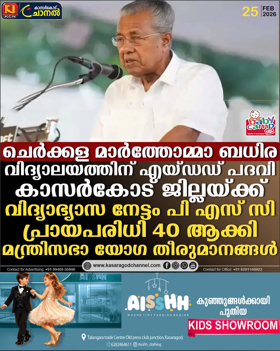 ആശ്വാസം പകരുന്ന നിര്ണ്ണായക തീരുമാനങ്ങളുമായി മുഖ്യമന്ത്രി പിണറായി വിജയന്റെ അധ്യക്ഷതയില് ചേര്ന്ന മന്ത്രിസഭാ യോഗം. പി.എസ്.സി പരീക്ഷാ പ്രായപരിധി ഉയര്ത്തിയത് മുതല് വീടുകള്ക്ക് ഇന്ഷുറന്സ് പരിരക്ഷ ഉറപ്പാക്കുന്ന പദ്ധതിക്ക് വരെ ചൊവ്വാഴ്ച, 2026 ഫെബ്രുവരി 24-ന് ചേര്ന്ന യോഗം അംഗീകാരം നല്കി. കാസര്കോട് ജില്ലയിലെ വിദ്യാഭ്യാസ, തൊഴില് മേഖലകളില് വലിയ ചലനമുണ്ടാക്കുന്ന തീരുമാനങ്ങളും ഇക്കൂട്ടത്തിലുണ്ട്.