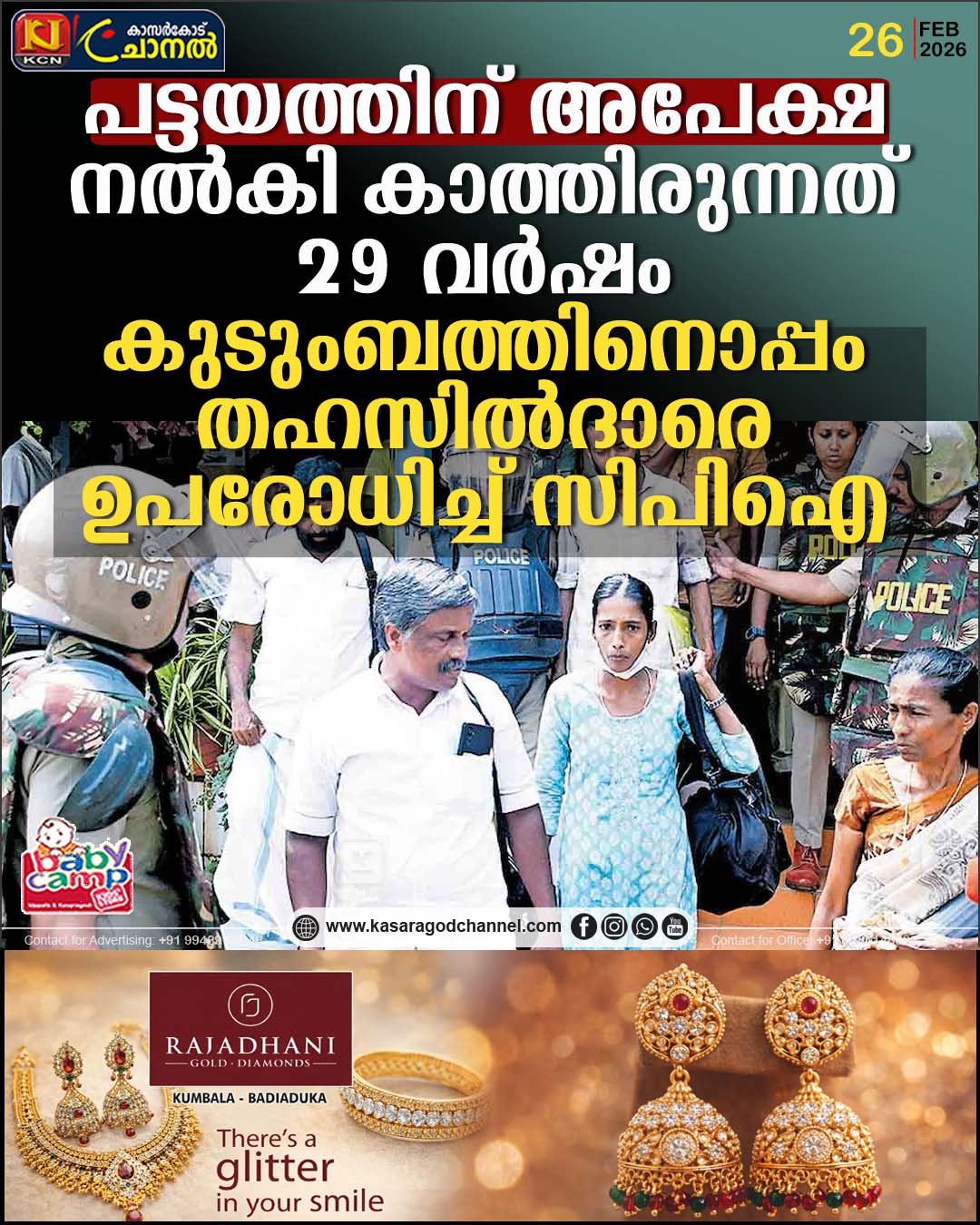 കാസര്കോട് 29 വര്ഷമായി അപേക്ഷ നല്കി പട്ടയത്തിനു കാത്തിരിക്കുന്ന കുടുംബത്തെ ഇന്നു നടക്കുന്ന പട്ടയമേളയിലും അവഗണിക്കുന്നു എന്നാരോപിച്ചു സിപിഐ കുടുംബത്തെ കുട്ടി കാസര്കോട് തഹസില്ദാരെ ഉപരോധിച്ചു. തുടര്ന്ന്, പൊലീസ് ഇവരെ അറസ്റ്റ് ചെയ്തു നീക്കി. ഉദ്യോഗസ്ഥഥ വീഴ്ചയാണെന്ന് സിപിഐ നേതാക്കള് ആരോപിച്ചു. പൊലീസ് അറസ്റ്റ് ചെയ്തപ്പോള് കണ്ണീരോടെയാണ് ശാന്തയും മകളും പുറത്തേക്കിറങ്ങിയത്.