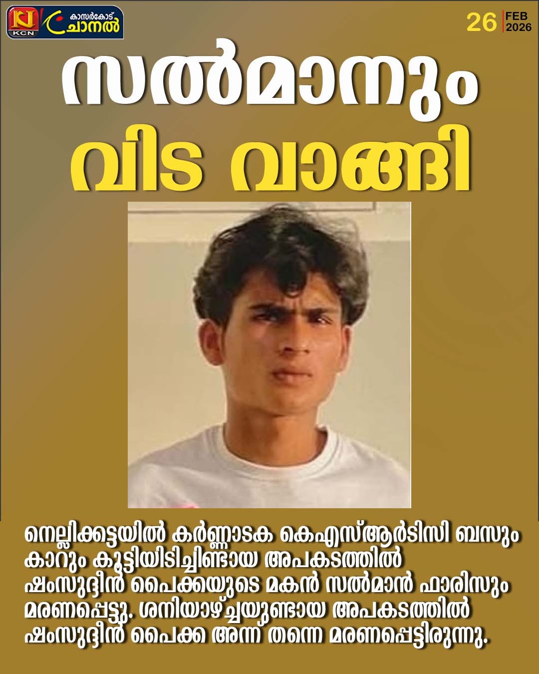 വിദ്യാനഗര്- ബദിയഡുക്ക പൊലീസ് സ്റ്റേഷനുകളുടെ അതിര്ത്തിയായ താഴെ നെല്ലിക്കട്ടയിലാണ് കഴിഞ്ഞ ശനിയാഴ്ച്ച അപകടമുണ്ടായത്. നെല്ലിക്കട്ടയില് താമസക്കാരനായ ഷംസുദ്ദീന് പൈക്ക അന്ന് മരണപ്പെടുകയും ചെയ്തിരുന്നു. സല്മാന് ഫാരിസ് ഓടിച്ച കാറും കാസര്കോടു നിന്നു പുത്തൂരിലേയ്ക്ക് പോവുകയായിരുന്ന കര്ണ്ണാടക കെ എസ് ആര് ടി സി ബസും കൂട്ടിയിടിച്ചായിരുന്നു അപകടം. സല്മാന് ഫാരിസിനെ ഗുരുതര പരിക്കുകളോടെ ആശുപത്രിയില് പ്രവേശിപ്പിക്കുകയും ചെയ്തിരുന്നു… 22 കാരനായ സല്ഫാന് ഫാരിസ് വ്യാഴാഴ്ച ഉച്ചയോടെ ഇന്ദിരാ നഗറിലെ സ്വകാര്യ ആശുപത്രിയില് വെച്ച് മരണപ്പെടുകയായിരുന്നു. അപകടത്തില് പിതാവിനു പിന്നാലെ മകനും മരിച്ച സംഭവം നാടിനെ വേദനയിലാഴ്ത്തി..