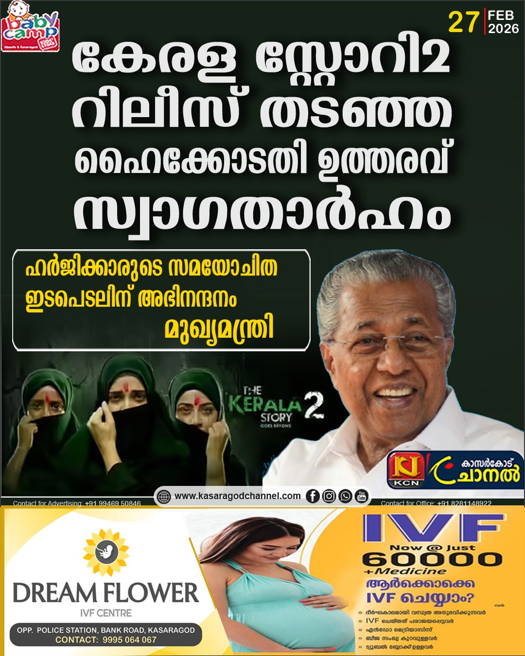 കേരള സ്റ്റോറി2 റിലീസ് തടഞ്ഞ ഹൈക്കോടതി ഉത്തരവ് സ്വാഗതാര്ഹം,ഹര്ജിക്കാരുടെ സമയോചിത ഇടപെടലിന് അഭിനന്ദനം;മുഖ്യമന്ത്രി