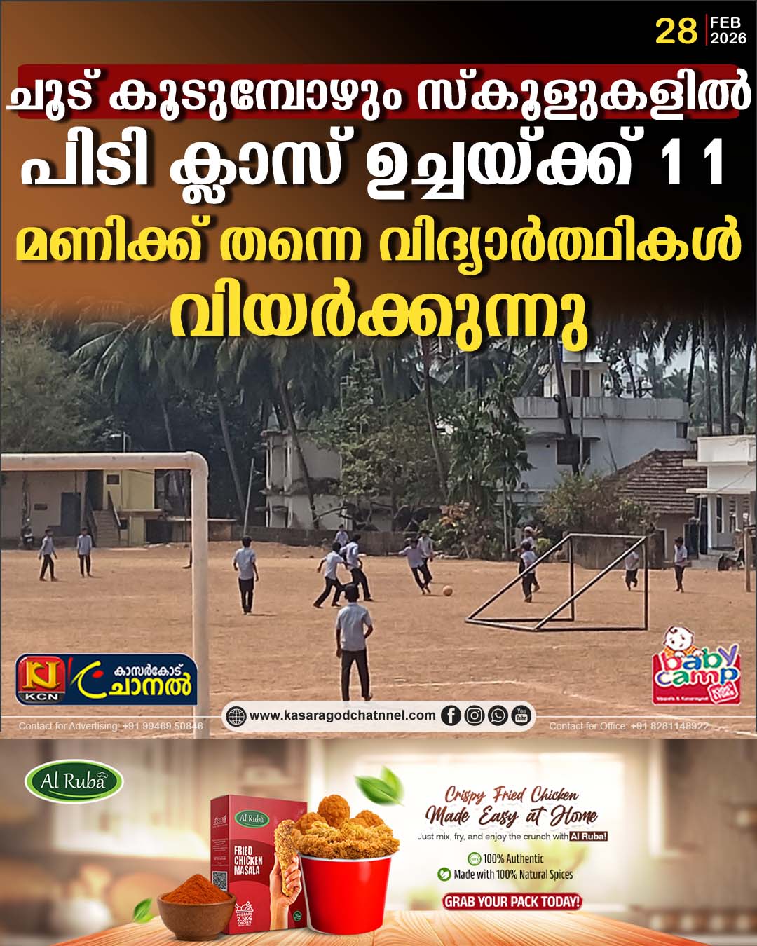 കാസര്ഗോഡ്. കത്തുന്ന വെയിലും, പൊള്ളുന്ന ചൂടും വിദ്യാര്ത്ഥികള്ക്ക് ഒരു പ്രശ്നമേയല്ല. അവര്ക്കുള്ള പി ടി ക്ലാസില് കത്തുന്ന വെയിലാണെങ്കിലും മൈതാനത്തിറങ്ങി കളിക്കും.പൊള്ളുന്ന ചൂടിലും,ആരോഗ്യ പ്രശ്നങ്ങളിലും അവര് ബോധവാന്മാരല്ല.ഈ വിഷയത്തില് വിദ്യാഭ്യാസ വകുപ്പ് സ്കൂള് അധികൃതര്ക്ക് ഒരു നിര്ദ്ദേശവും നല്കിയിട്ടുമില്ല. അതുകൊണ്ടുതന്നെ കുട്ടികളെ കളിക്കുന്നതില് നിന്ന് അധ്യാപകര് തടയുന്നുമില്ല.