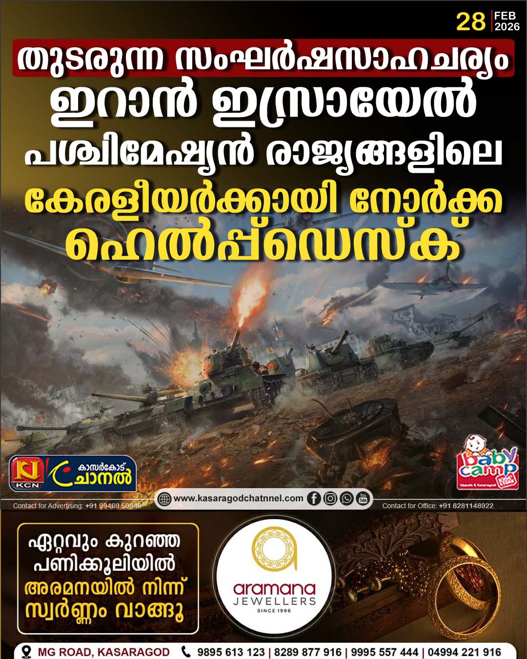 തുടരുന്ന സംഘര്ഷസാഹചര്യം…ഇറാന്, ഇസ്രായേല് പശ്ചിമേഷ്യന് രാജ്യങ്ങളിലെ കേരളീയര്ക്കായി നോര്ക്ക ഹെല്പ്പ്ഡെസ്ക്By kcnchannel / February 28, 2026 ഇറാന്, ഇസ്രായേല് പശ്ചിമേഷ്യന് രാജ്യങ്ങള് എന്നീ മേഖലകളില് സംഘര്ഷസാധ്യത നിലനില്ക്കുന്ന പശ്ചാത്തലത്തില് മുഖ്യമന്ത്രിയുടെ ഓഫീസിന്റെ നിര്ദ്ദേശപ്രകാരം കേരളീയര്ക്കായി നോര്ക്ക റൂട്ട്സ് ഹെല്പ്പ്ഡെസ്ക് പ്രവര്ത്തനം ആരംഭിച്ചു. സഹായം ആവശ്യമുളള കേരളീയര്ക്ക് നോര്ക്ക ഗ്ലോബല് കോണ്ടാക്ട് സെന്ററിലെ ഹെല്പ് ഡെസ്ക് നമ്പറുകളായ +91-8802012345 (അന്താരാഷ്ട്ര മിസ്ഡ് കോള്), 18004253939 (ടോള് ഫ്രീ നമ്പര്, ഇന്ത്യയില് നിന്നും) എന്നിവയില് ബന്ധപ്പെട്ട് രജിസ്റ്റര് ചെയ്യാവുന്നതാണ്. ഇന്ത്യന് പൗരന്മാര് അതാത് രാജ്യങ്ങളിലെ ഇന്ത്യന് എംബസികളുടെയും കേന്ദ്ര വിദേശകാര്യ മന്ത്രാലയത്തിന്റെയും നിര്ദ്ദേശങ്ങള് പാലിക്കേണ്ടതുമാണ്.