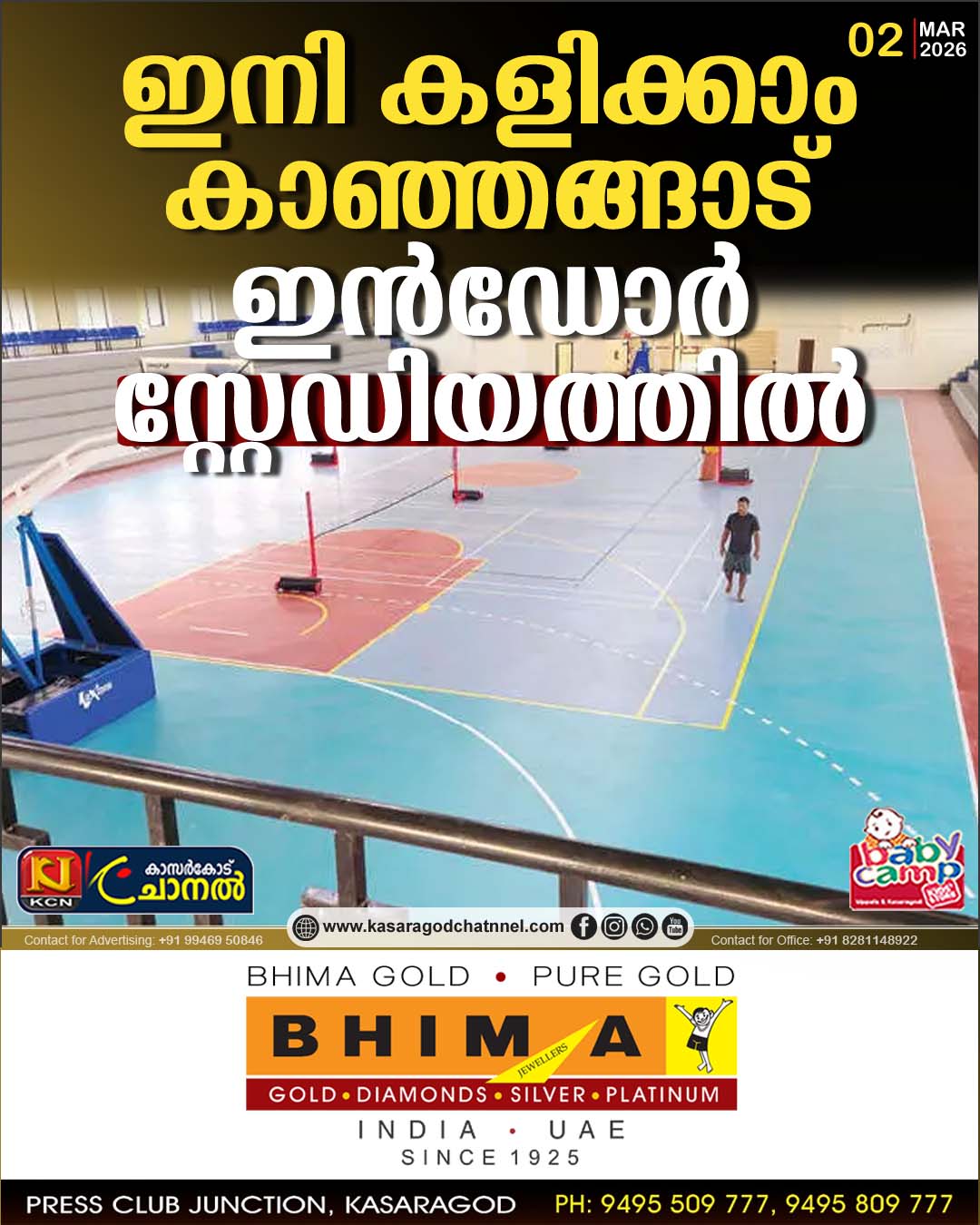 അലാമിപ്പള്ളിയിലെ ഇന്ഡോര് സ്റ്റേഡിയം തുറക്കുന്നു. മൂന്നിന് വൈകീട്ട് അഞ്ചിന് ഇ. ചന്ദ്രശേഖരന് എം.എല്.എ. ഉദ്ഘാടനം ചെയ്യും. തെറ്റായ രീതിയില് നിര്മിച്ച് ഉദ്ഘാടനം ചെയ്യാനൊരുങ്ങിയപ്പോള്, ‘മാതൃഭൂമി’ അങ്ങനെയല്ല വേണ്ടതെന്ന് പറഞ്ഞ് മുന്നോട്ടുവന്നു.