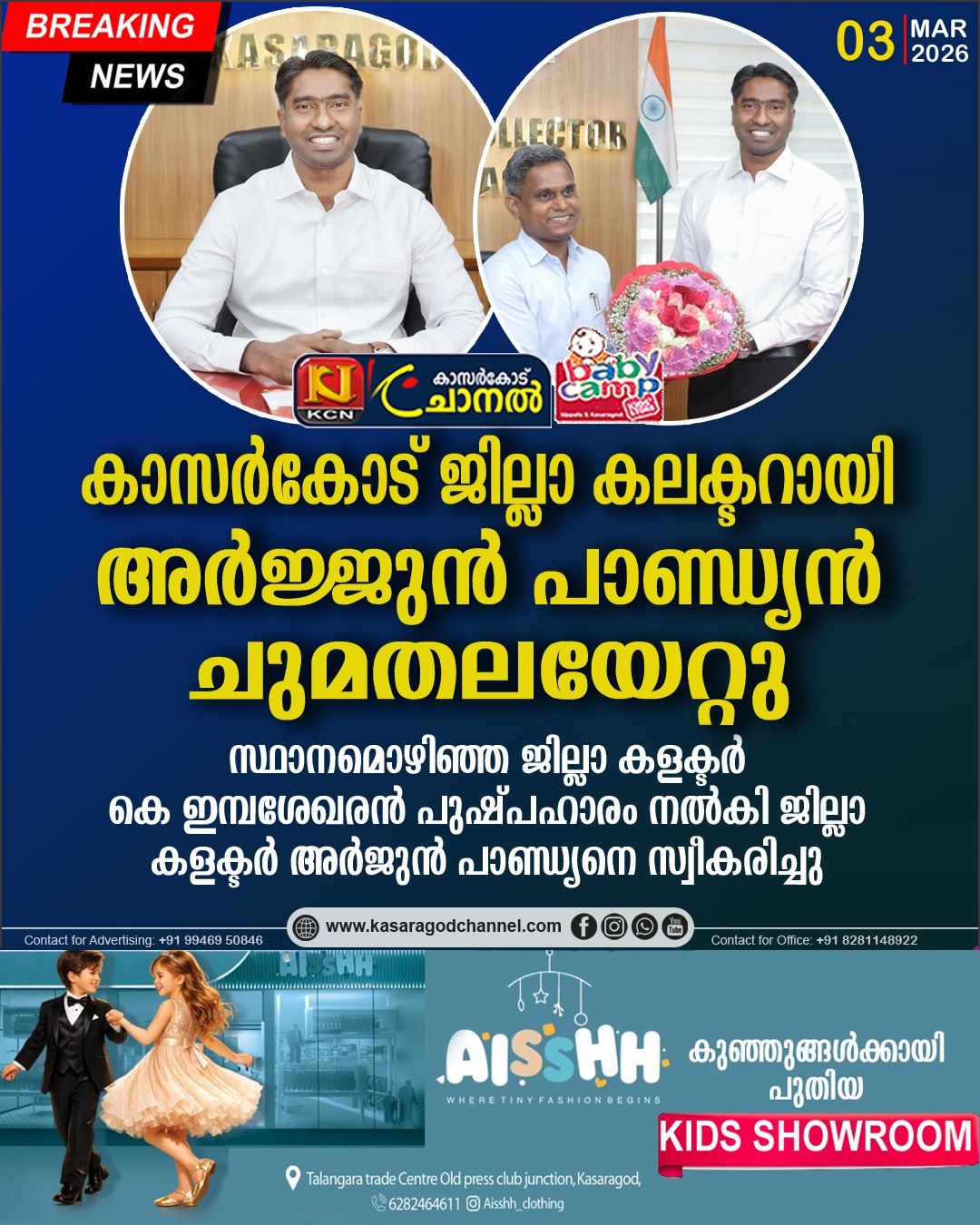 അര്ജ്ജുന് പാണ്ഡ്യന് ഐ എ എസ് കാസര്കോട് ജില്ലാ കളക്ടറായി ചുമതലയേറ്റു. രാവിലെ 10 ന് സിവില് സ്റ്റേഷനില് എത്തി കാസര്കോട് ജില്ലാ കളക്ടര് കെ. ഇമ്പശേഖറില് നിന്ന് ചുമതല സ്വീകരിച്ചു.. അര്ജ്ജുന് പാണ്ഡ്യന് തൃശ്ശൂര് ജില്ലാ കളക്ടറായിരുന്നു. ചീഫ് സെക്രട്ടറിയുടെ സ്റ്റാഫ് ഓഫീസര്, ലേബര് കമ്മിഷണര് പദവികള് വഹിച്ചിട്ടുണ്ട്. 2017 ബാച്ച് കേരള കേഡര് ഐ.എ.എസ് ഉദ്യോഗസ്ഥനായ അര്ജ്ജുന് പാണ്ഡ്യന് കണ്ണൂര് അസി. കളക്ടര്, ഒറ്റപ്പാലം, മാനന്തവാടി സബ് കളക്ടര്, അട്ടപ്പാടി നോഡല് ഓഫീസര്, ഇടുക്കി ഡവലപ്മെന്റ് കമ്മീഷണര്, അഡിഷണല് ഡിസ്ട്രിക്ട് മജിസ്ട്രേറ്റ് ശബരിമല, റവന്യൂ വകുപ്പ് ജോയിന്റ് കമ്മിഷണര്, സംസ്ഥാന ലാന്ഡ്ബോര്ഡ് സെക്രട്ടറി, സാമൂഹിക സന്നദ്ധ സേന ഡയറക്ടര്, ഹൗസിംഗ് ബോര്ഡ് സെക്രട്ടറി, പട്ടികവര്ഗ്ഗ വികസന വകുപ്പ് ഡയറക്ടര് തുടങ്ങിയ ചുമതലകള് വഹിച്ചിട്ടുണ്ട്. കാസര്കോടിന്റെ ഇരുപത്തിയാറാമത് ജില്ലാ കളക്ടറായാണ് അര്ജ്ജുന് പാണ്ഡ്യന് ചുമതലയേല്ക്കുന്നത്. സംസ്ഥാനത്തെ മികച്ച ജില്ലാ കളക്ടര്ക്കുള്ള പുരസ്ക്കാരം നേടി തൃശ്ശൂര് ജില്ലയിലെ ഒന്നരവര്ഷത്തിലേറെ നീണ്ട മികച്ച സേവനത്തിനുശേഷം വികസനത്തിന്റെ പുത്തന് മാതൃകകള് തൃശ്ശൂരിന് സമ്മാനിച്ചാണ് അര്ജുന് പാണ്ഡ്യന് കാസര്കോട് ജില്ലയിലേക്ക് എത്തുന്നത്.