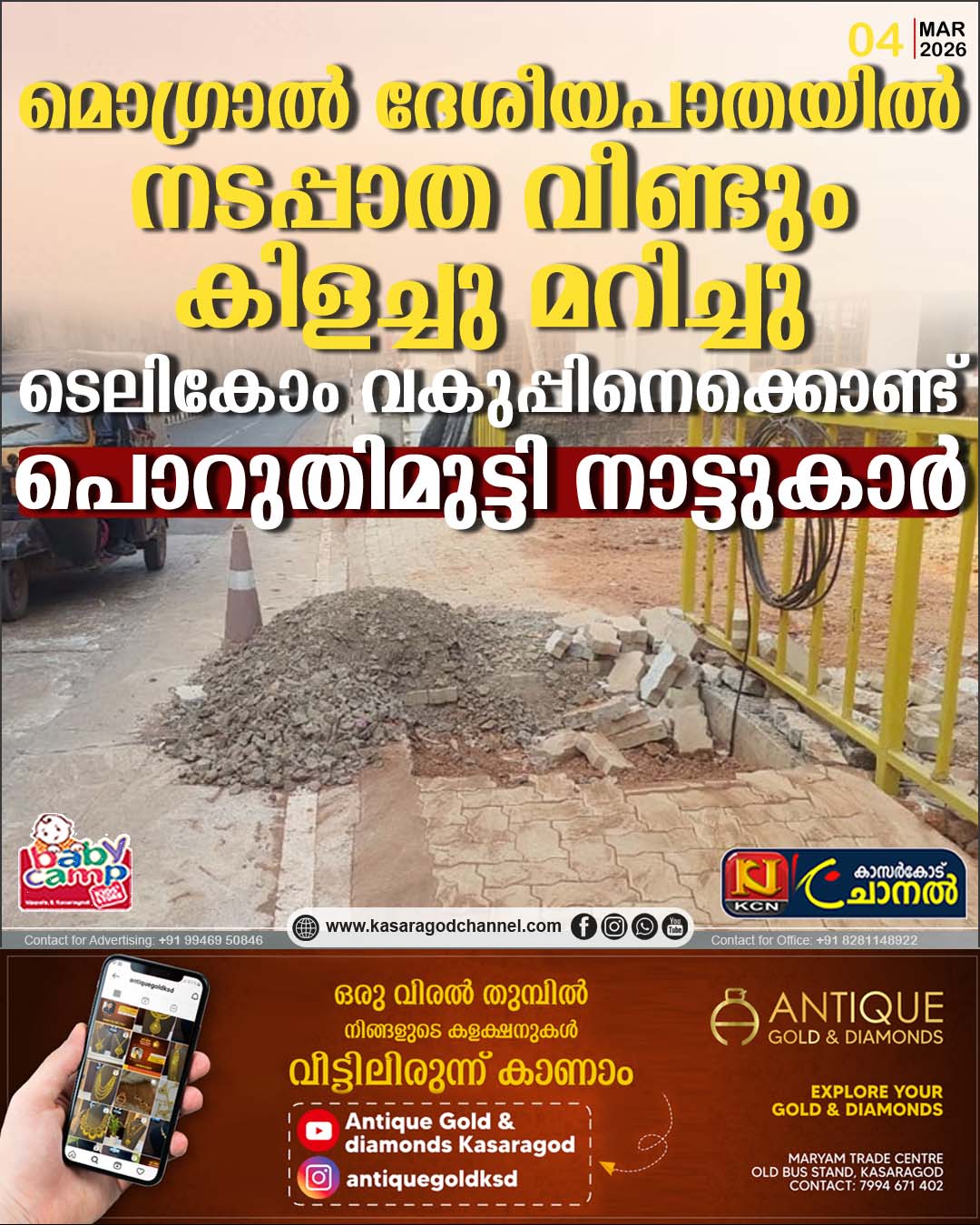 കഴിഞ്ഞവര്ഷം ഇത്തരത്തില് മൊഗ്രാലില് വിവിധ ഭാഗങ്ങളില് നടപ്പാത തകര്ത്ത് ജോലി ചെയ്യുന്നതിനെ ചോദ്യം ചെയ്തു സന്നദ്ധ സംഘടന പ്രവര്ത്തകര് ജില്ലാ കലക്ടറുടെ ശ്രദ്ധയില്പ്പെടുത്തിയിരുന്നു. ബന്ധപ്പെട്ടവര് സ്ഥലം സന്ദര്ശിച്ച് ടെലിക്കോം കമ്പനി അധികൃതര്ക്ക് കുഴികള് മുടാനും നടപ്പാത പൂര്വസ്ഥിതിയിലാ ക്കാനും നിര്ദ്ദേശവും നല്കിയിരുന്നതാണ്. എന്നിട്ടും ടെലിഗ്രാം വക 8 = 8 നടത്തുന്ന ധിക്കാര നടപടികള്ക്കെതിരെ അധികൃതര് കര്ശന നിലപാടെടുക്കണമെന്നു നാട്ടുകാര് ആവശ്യപ്പെട്ടു.