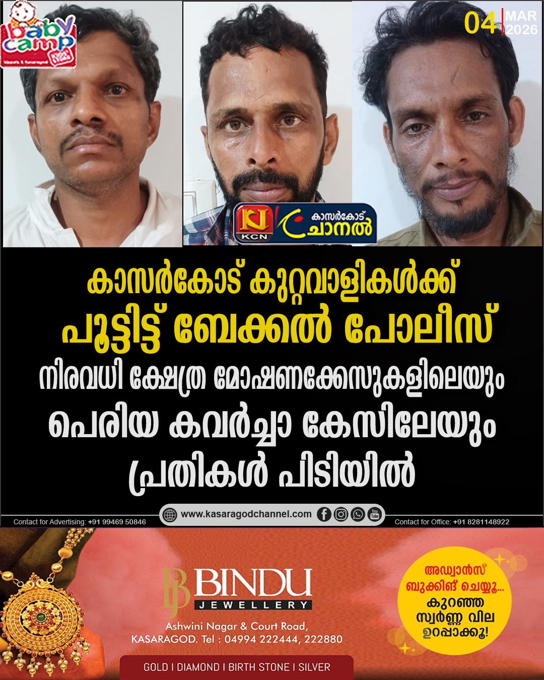 ബേക്കല് പോലീസ് സ്റ്റേഷന് പരിധിയില് വിവിധ ഭാഗങ്ങളില് നടന്ന മോഷണക്കേസുകളില് മിന്നല് വേഗത്തില് പ്രതികളെ പിടികൂടി ബേക്കല് പോലീസ് . ഉദുമയിലെ ക്ഷേത്രത്തില് ഭണ്ഡാരം കവര്ന്ന പ്രതിയെ മണിക്കൂറുകള്ക്ക കമാണ് വലയിലാക്കിയത്. പെരിയയില് നടന്ന വന് കവര്ച്ചയിലെ പ്രതികളെയും പോലീസ് സാഹസികമായി പിടികൂടി.