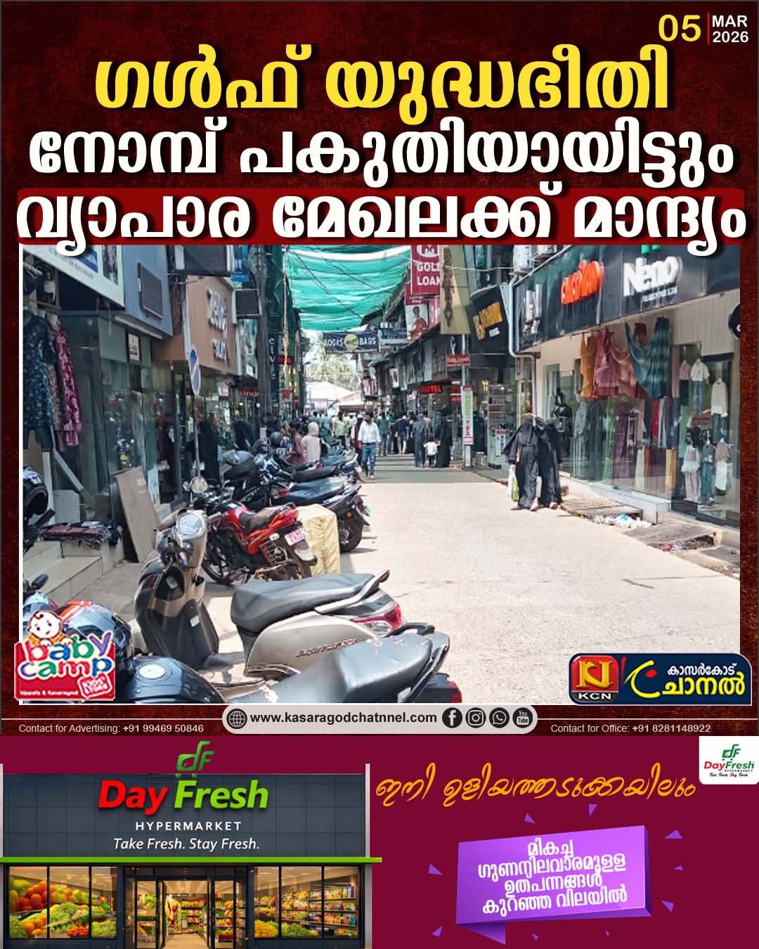 നോമ്പു പകുതിയായിട്ടും ജില്ലയിലെ വ്യാപാര മേഖല മന്ദീഭവിച്ചു നില്ക്കുന്നു. സ്വര്ണ്ണവില വര്ധന, എണ്ണ വില വര്ധന ഭീഷണി, നിത്യോപയോഗ സാധനങ്ങളുടെ വില വര്ധന ഭീഷണി എന്നിവയുടെ ആശങ്കയിലാണ് ജനങ്ങള്. നോമ്പു പകുതിയായിട്ടും വസ്ത്ര വ്യാപാര മേഖല സജീവമായിട്ടില്ല. ജി സി സി രാജ്യങ്ങളെ യുദ്ധഭീതി ബാധിച്ചതു മലയാളികളടക്കമുള്ള ഇന്ത്യക്കാരെ പ്രതികൂലാവസ്ഥയിലാക്കിയിട്ടുണ്ട്. ഇതു നാട്ടിലെ സകല ഇടപാടുകളെയും പ്രതികൂലമായി ബാധിച്ചു കൊണ്ടിരിക്കുന്നു. നിര്മ്മാണ മേഖലയിലും ഇതിന്റെ ആഘാതം ഉടലെടുത്തിട്ടുണ്ട്. കാസര്കോട്ടു വന്കിട വ്യാപാര സമുച്ചയങ്ങള് കൂടി വരുന്നതു ചെറുകിട വ്യാപാര സ്ഥാപനങ്ങള്ക്കു ഭീഷണിയായിട്ടുണ്ട്. ഈ സാഹചര്യത്തില് യുദ്ധ ഭീഷണി കുടി സംജാതമായത് ചെറുകിട വ്യാപാര മേഖലയെ തളര്ത്തുന്നു. പെരുന്നാള് ആഘോഷത്തിനു നാട്ടിലേക്കു വരാന് കാത്തിരുന്ന പ്രവാസികള് അനിശ്ചിതത്വത്തിലായിരിക്കുന്നു. ജി സി സി മേഖലയില് ഇറാന് ഇപ്പോഴും ആക്രമണം തുടരുന്നുണ്ട്. തലക്കു മുകളിലൂടെ മിസൈലുകള് പായുമ്പോള് സമാധാനത്തോടെ ഉറങ്ങാന് പോലും കഴിയാതെ പ്രവാസികള് ഭയന്നു വിറക്കുന്നു. അനാവശ്യമായി ആരും