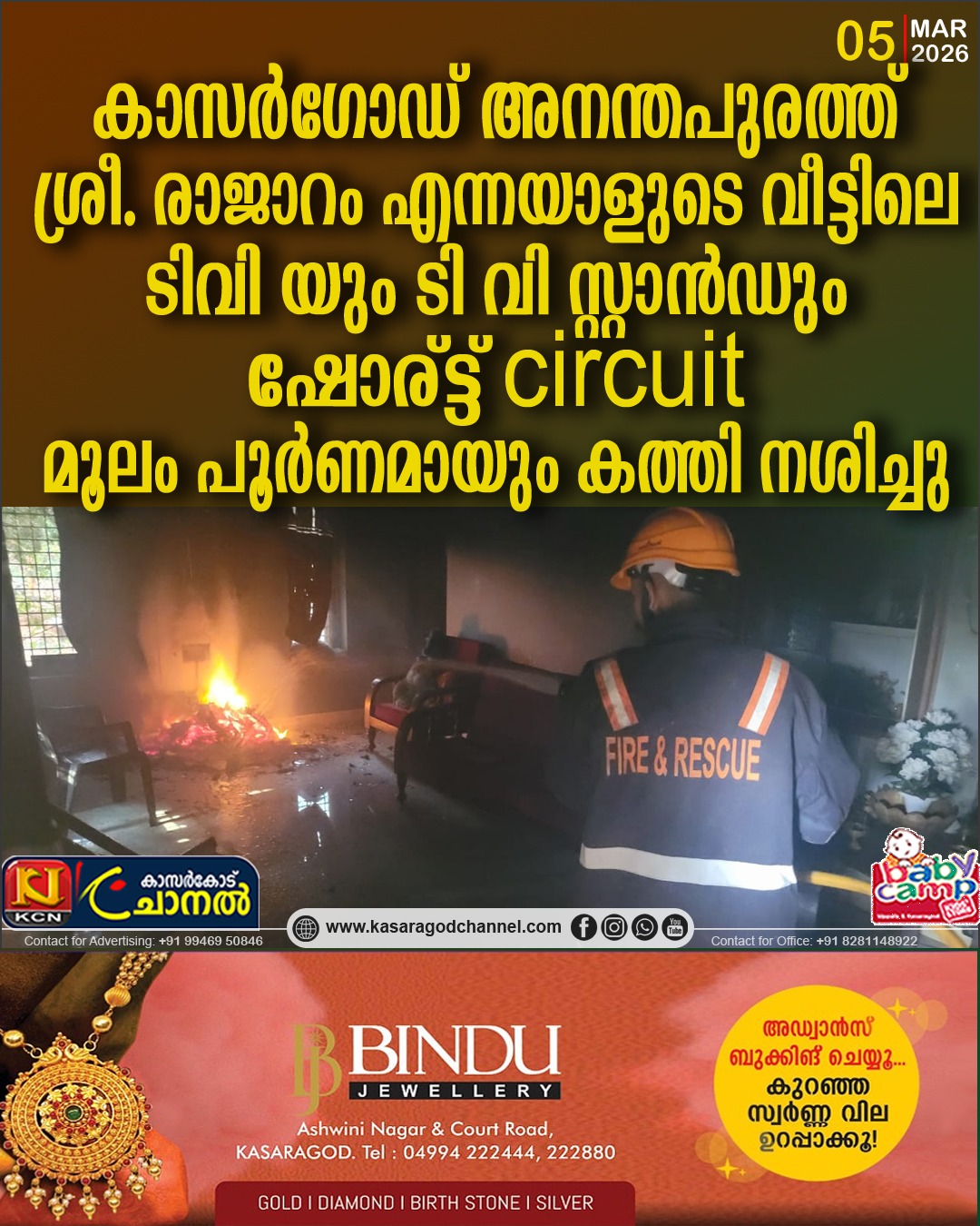 കാസര്ഗോഡ് അനന്തപുരത്തു ശ്രീ. രാജാറം എന്നയാളുടെ വീട്ടിലെ ടിവി യും ടി വി സ്റ്റാന്ഡും ഷോര്ട്ട് circuit മൂലം പൂര്ണമായും കത്തി നശിച്ചു.