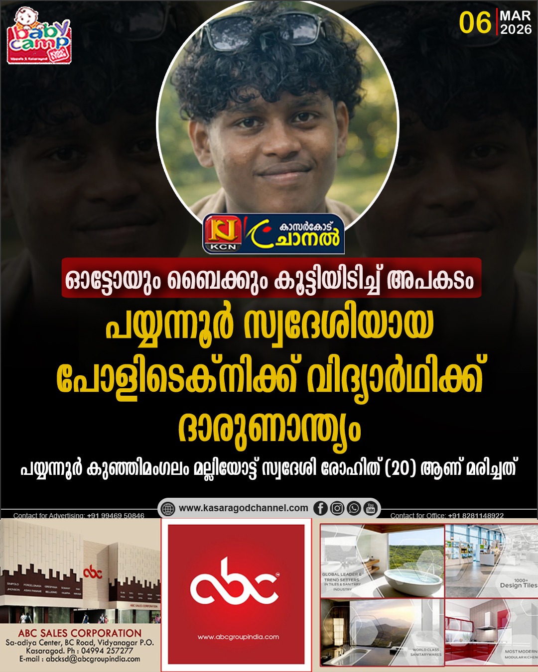 ഓട്ടോറിക്ഷയും ബൈക്കും കൂട്ടിയിടിച്ചുണ്ടായ അപകടത്തില് ബൈക്ക് യാത്രക്കാരനായ പോളിടെക്നിക്ക് വിദ്യാര്ഥി മരിച്ചു. പയ്യന്നൂര് കുഞ്ഞിമംഗലം മല്ലിയോട്ട് സ്വദേശി രോഹിത് (20) ആണ് മരിച്ചത്. കൂടെയുണ്ടായിരുന്ന അലന് (19) എന്ന വിദ്യാര്ഥിയെ ഗുരുതരനിലയില് മംഗലാപുരം ആശുപത്രിയിലേക്ക് മാറ്റി.