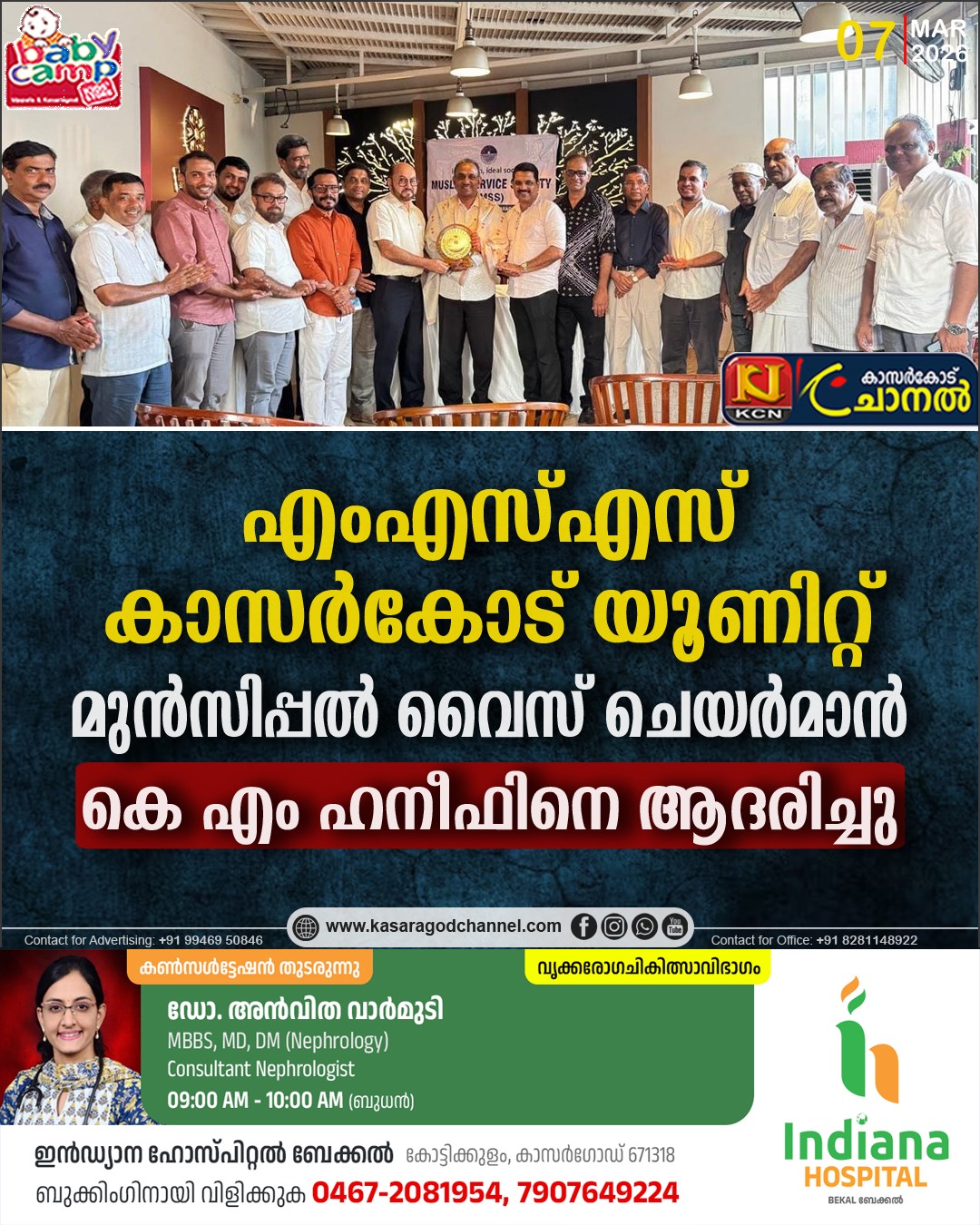 എംഎസ്എസ് കാസര്കോട് യൂണിറ്റ് മുന്സിപ്പല് വൈസ് ചെയര്മാന് കെ എം ഹനീഫിനെ ആദരിച്ചു
