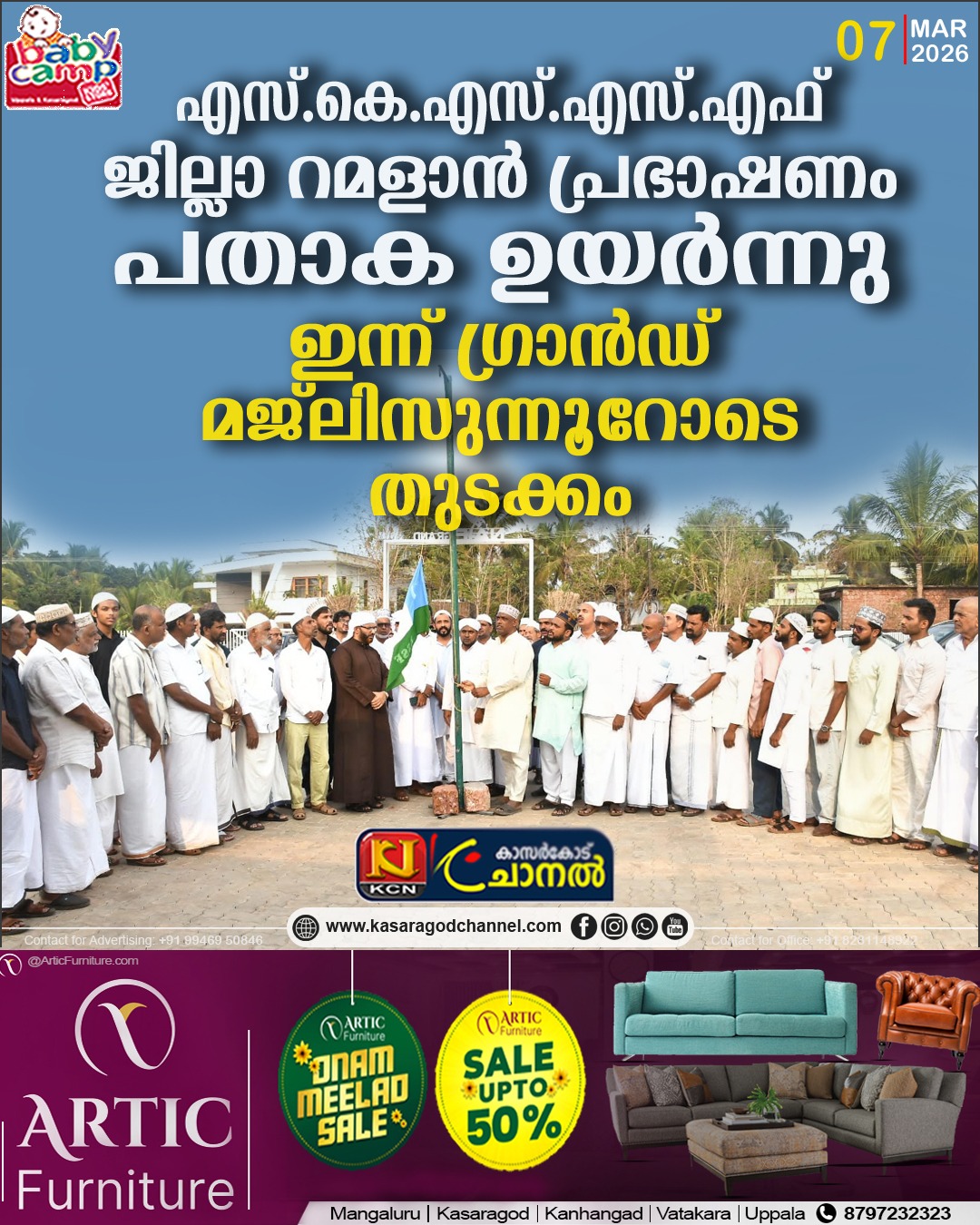 തുടര്ന്ന് നടക്കുന്ന റമളാന് പ്രഭാഷണ സമ്മേളനം സമസ്ത കേന്ദ്ര മുശാവറ അംഗം അബ്ദുസ്സലാം ദാരിമി ആലമ്പാടി ഉദ്ഘാടനം ചെയ്യും. സ്വാഗതസംഘം ചെയര്മാന് എം.എ.എച്ച് അഷ്റഫ് ഹാജി അധ്യക്ഷത വഹിക്കും. സിഎം അബ്ദുല് ഖാദര് ഹാജി ചെര്ക്കള മുഖ്യാതിഥിയായിരിക്കും. സിദ്ദീഖ് നദ്വി ചേരൂര് പ്രാരംഭ പ്രാര്ത്ഥന നടത്തും. അബ്ദു റസാഖ് അബറാറി മുഖ്യപ്രഭാഷണം നടത്തും. ജില്ലാ ട്രഷറര് സഈദ് അസ്അദി പുഞ്ചാവി സ്വാഗതവും, സ്വാഗതസംഘം വര്ക്കിംഗ് കണ്വീനര് അസ്ലം റഹ്മത്ത് നഗര് നന്ദിയും പറയും.