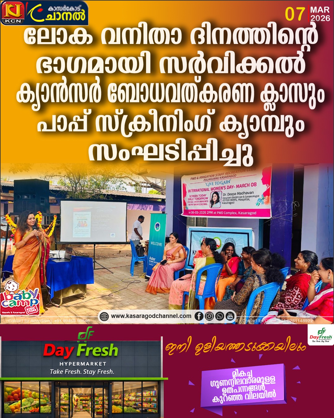 കാസര്ഗോഡ് : മാര്ച്ച് 8-ാം തീയതി ആചരിക്കുന്ന ലോക വനിതാ ദിനത്തോടനുബന്ധിച്ച് ആസ്റ്റര് മിംസ് ഹോസ്പിറ്റല് കാസര്ഗോഡും Obstetric and Gynaecological Society കാസര്ഗോഡും സംയുക്തമായി PWD വകുപ്പിലെ വനിതാ ജീവനക്കാര്ക്കായി പ്രത്യേക ബോധവത്കരണ പരിപാടി സംഘടിപ്പിച്ചു.