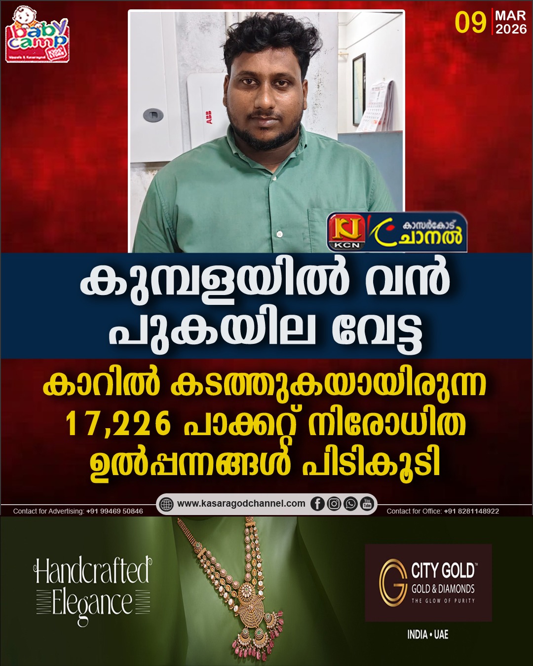 കുമ്പളയില് വന് പുകയില വേട്ട:കാറില് കടത്തുകയായിരുന്ന 17,226 പാക്കറ്റ് നിരോധിത ഉല്പ്പന്നങ്ങള് പിടികൂടി.