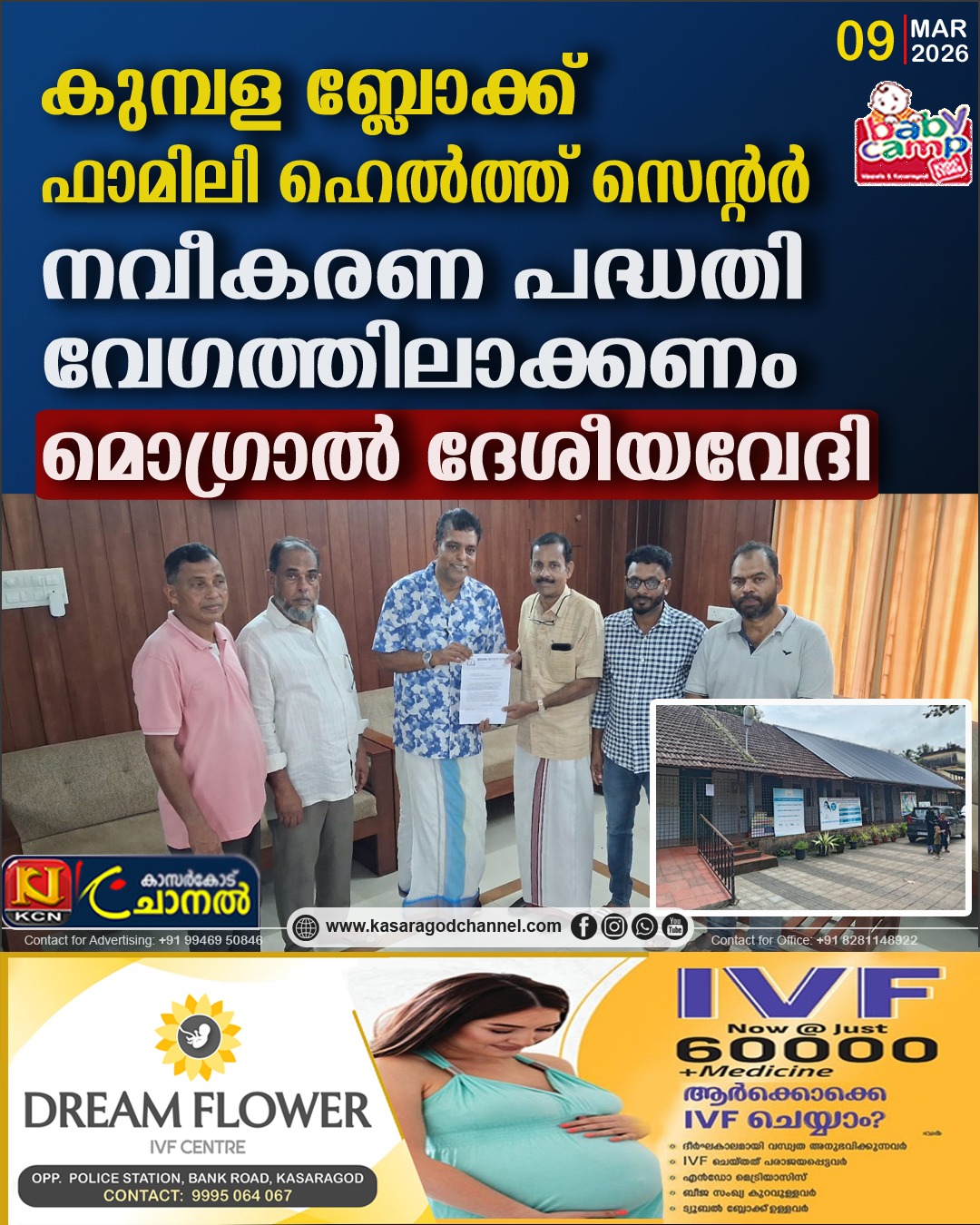 ബ്ലോക്ക് ഫാമിലി ഹെല്ത്ത് സെന്ററിന്റെ നവീകരണ പദ്ധതി എത്രയും പെട്ടെന്ന് നടപ്പിലാക്കാന് നടപടി സ്വീകരിക്കണമെന്ന് മൊഗ്രാല് ദേശീയവേദി ആവശ്യപ്പെട്ടു. പ്രസിഡണ്ട് എ എം സിദ്ദീഖ് റഹ്മാന്,ജനറല് സെക്രട്ടറി പി എം മുഹമ്മദ്,ഉപദേശക സമിതി ചെയര്മാന് എം മാഹിന് മാസ്റ്റര്, ജോയിന് സെക്രട്ടറിമാരായ ബി എ മുഹമ്മദ് കുഞ്ഞി, അഷ്റഫ് സാഹിബ് എന്നിവരാണ് നിവേദനം നല്കിയത്.