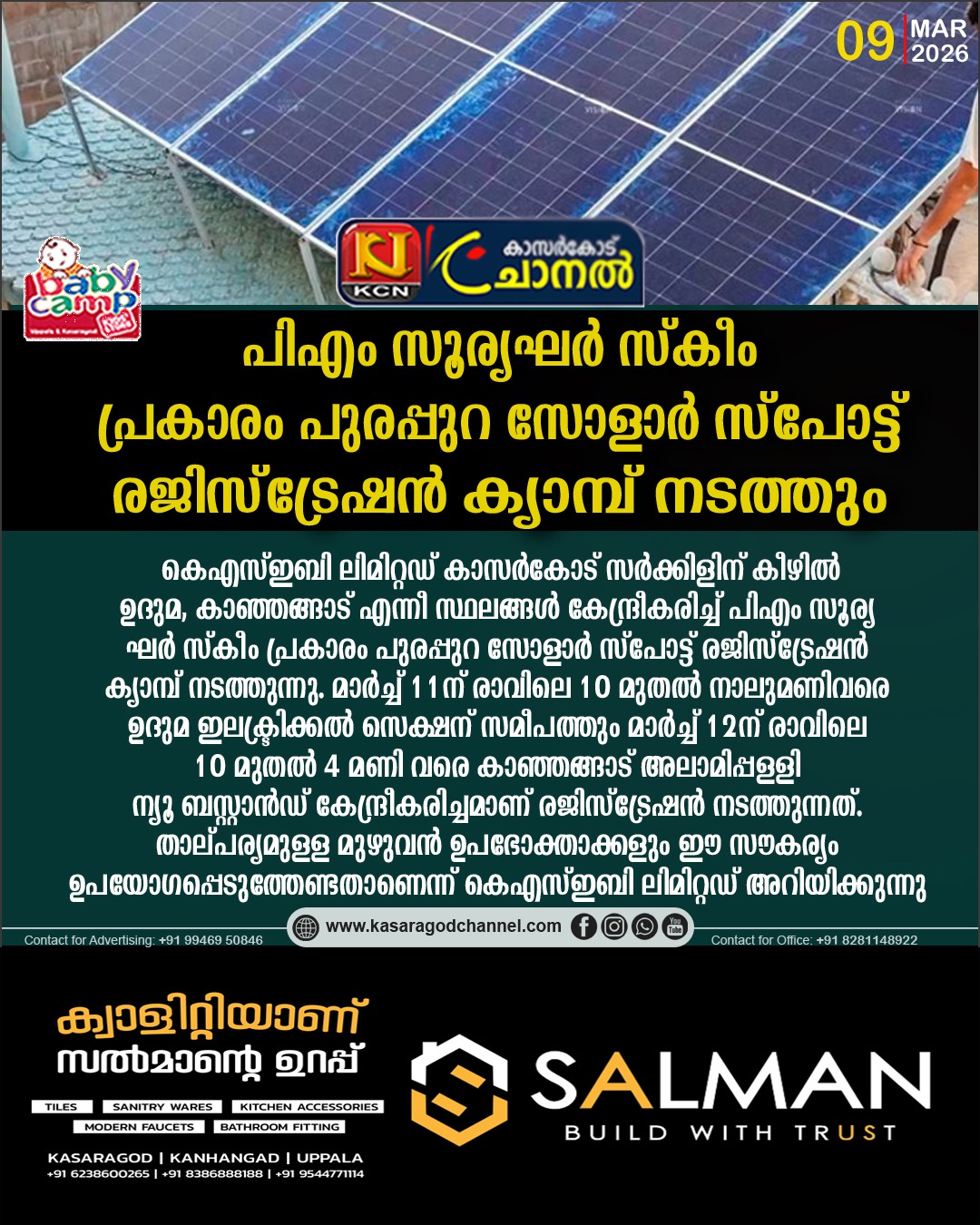 കെഎസ്ഇബി ലിമിറ്റഡ് കാസര്ഗോഡ് സര്ക്കിളിന് കീഴില് ഉദുമ, കാഞ്ഞങ്ങാട് എന്നീ സ്ഥലങ്ങള് കേന്ദ്രീകരിച്ച് പിഎം സൂര്യ ഘര് സ്കീം പ്രകാരം പുരപ്പുറ സോളാര് സ്പോട്ട് രജിസ്ട്രേഷന് ക്യാമ്പ് നടത്തുന്നു. മാര്ച്ച് 11ന് രാവിലെ 10 മുതല് നാലുമണിവരെ ഉദുമ ഇലക്ട്രിക്കല് സെക്ഷന് സമീപത്തും മാര്ച്ച് 12ന് രാവിലെ 10 മുതല് 4 മണി വരെ കാഞ്ഞങ്ങാട് അലാമിപ്പള്ളി ന്യൂ ബസ്റ്റാന്ഡ് കേന്ദ്രീകരിച്ചമാണ് രജിസ്ട്രേഷന് നടത്തുന്നത്. താല്പര്യമുള്ള മുഴുവന് ഉപഭോക്താക്കളും ഈ സൗകര്യം ഉപയോഗപ്പെടുത്തേണ്ടതാണെന്ന് കെഎസ്ഇബി ലിമിറ്റഡ് അറിയിക്കുന്നു