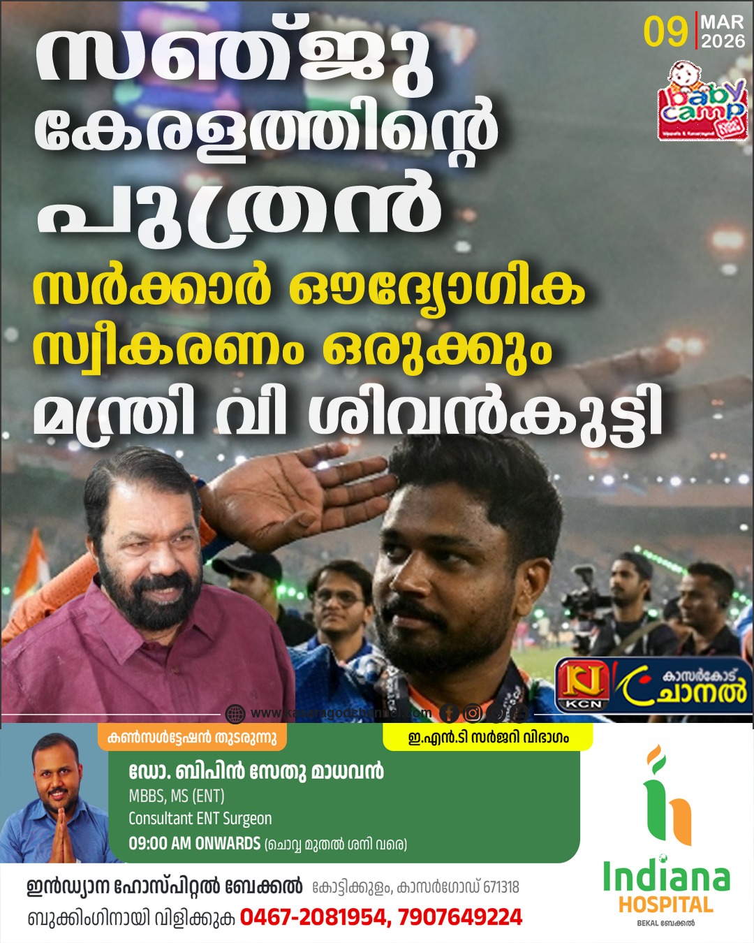 ട്വന്റി ട്വന്റി ലോക കപ്പില് ഇന്ത്യയുടെ വിജയശില്പിയും പ്ളേയര് ഓഫ് ദ ടൂര്ണമെന്റുമായ സഞ്ജു സാംസണ് സംസ്ഥാന സര്ക്കാരിന്റെ ഔദ്യോഗിക സ്വീകരണം തിരുവനന്തപുരത്ത് നല്കുമെന്ന് മന്ത്രി വി ശിവന്കുട്ടി.