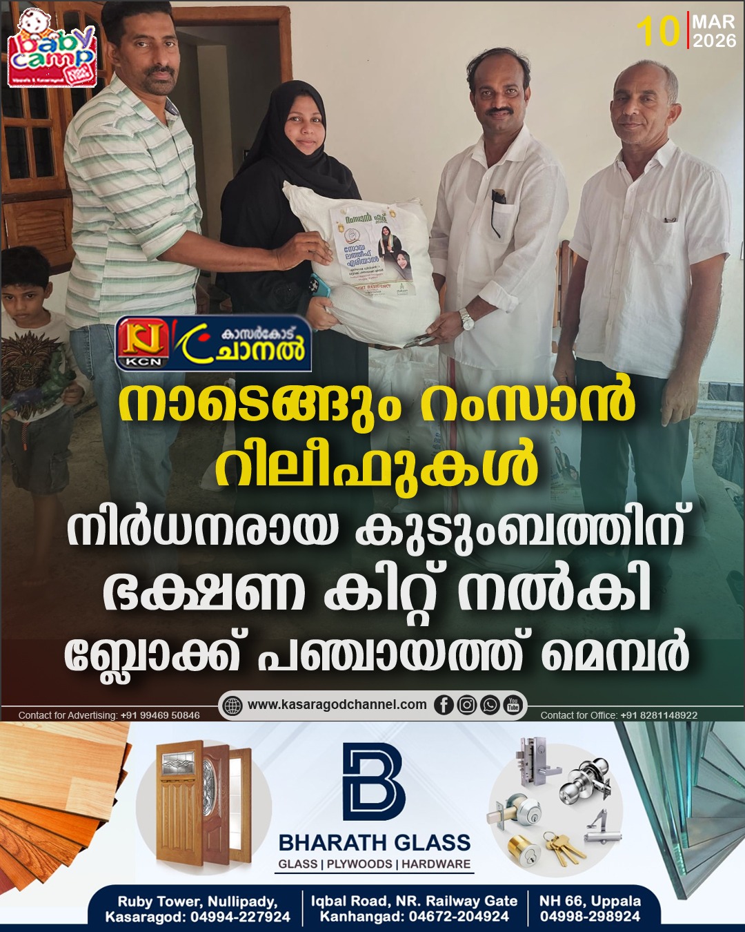 മൊഗ്രാല് പുത്തൂര്. മൊഗ്രാല് പുത്തൂര് ഗ്രാമ പഞ്ചായത്ത് പരിധിയിലെ നിര്ധരായ കുടുംബങ്ങളെ കണ്ടെത്തി പവിത്രമായ റംസാന്റെ മഹത്വം ഉള്കൊണ്ട് കൊണ്ട് റിലീഫ് പ്രവര്ത്തനങ്ങളുടെ ഭാഗമായി ഭക്ഷണ കിറ്റ് നല്കി കാസര്കോട് ബ്ലോക് പഞ്ചായത്ത് എരിയാല് ഡിവിഷന് മെമ്പര് സോയ ലത്തീഫ് മാതൃകയായി.