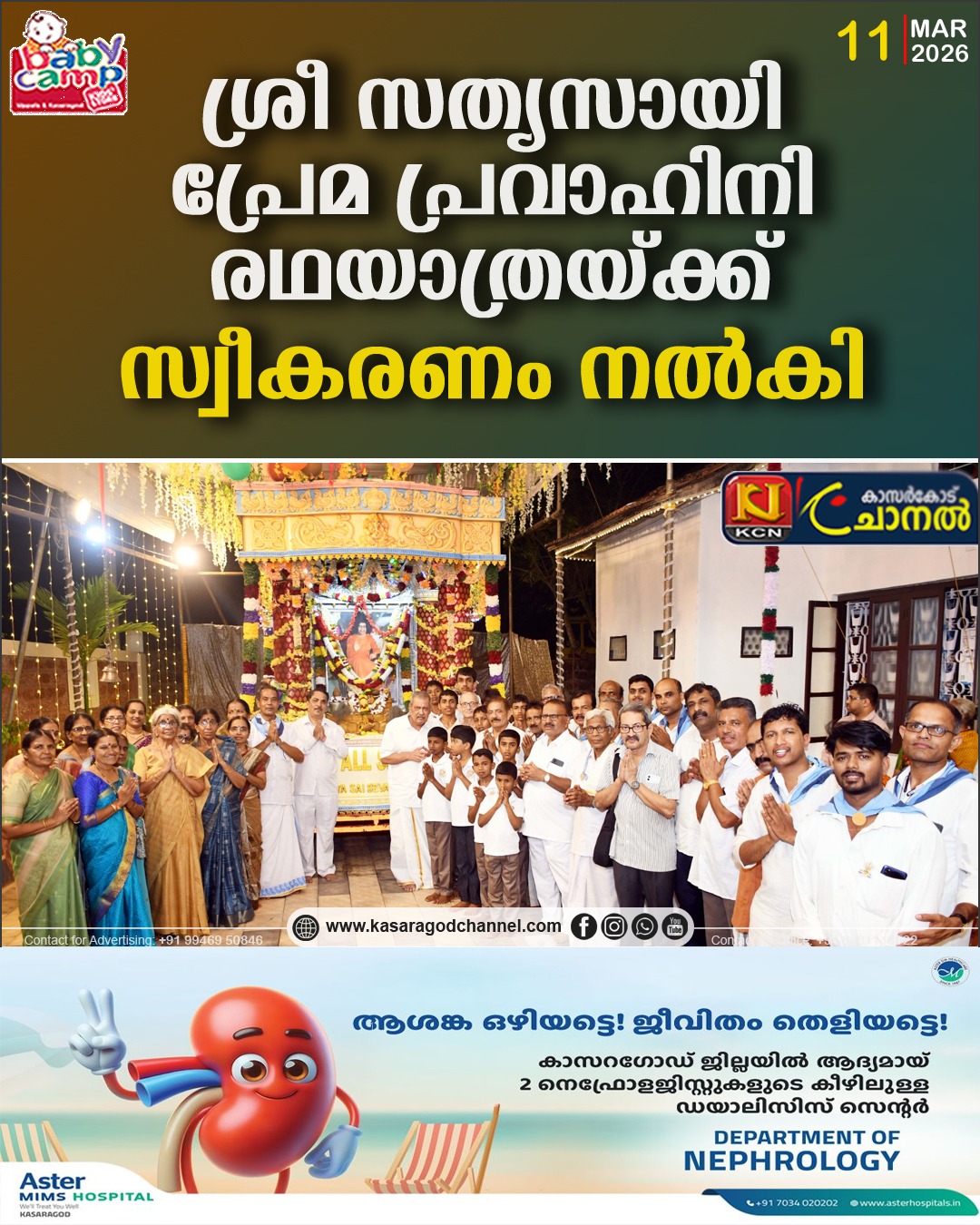 കാസറഗോഡ് — ഭഗവാന് ശ്രീ സത്യസായി ബാബയുടെ ജന്മശതാബ്ധി ആഘോഷത്തിന്റെ ഭാഗമായി രാജ്യവ്യാപകമായി സഞ്ചരിക്കുന്ന ശ്രീ സത്യസായി പ്രേമ പ്രവാഹിനി രഥയാത്രയ്ക്ക് കാസറഗോഡ് താളിപടപ്പു സത്യസായി അഭയനികേതന് ന്റെ ആഭിമുഖ്യത്തില് സ്വീകരണം നല്കി .കാസറഗോഡ് ശ്രീ മല്ലികാര്ജുന ക്ഷേത്ര പരിസരത്തില് നിന്ന് ആരംഭിച്ച ശോഭായാത്ര യ്ക്ക് ഉജ്ജ്വല സ്വീകരണത്തോടെയാണ് താളിപടപ്പു സത്യാ സായി അഭയനികേതനില് എത്തിയത് .തുടര്ന് പാദുക ദര്ശനം , സല്സംഗം, തുടര്ന് ധാര്മിക സഭ യില് ശ്രീ സത്യ സായി സേവാ കര്ണാടക സംസ്ഥാന കോ -ഓര്ഡിനേറ്റര് ജഗനാഥ് നാടിഗേറ മുഖ്യപ്രഭാസനം നടത്തി . സത്യാ സായി ജില്ലാ പ്രസിഡന്റ് എഛ് .മഹാലിംഗ ഭട്ട് , താളിപടപ്പു ശ്രീ സത്യസായി അഭയനികേതന് പ്രസിഡന്റ് dr ,എസ് .ബി.കണ്ടിഗെ ,സെക്രട്ടറി പി.ലത ,മനോഹര നായക് ,പി.വൃന്ദ ,കവിത വി റാവു ,സി.എന് .രാമകൃഷ്ണ ,അശോക് ബാംഗ്ലൂര് എന്നിവര് സംബഡിച്ചു .അഭയനികേതന് ജോയിന്റ് സെക്രട്ടറി ബി.പ്രേംപ്രകാശ് സ്വാഗതം .തുടര്ന് മഹാ മംഗളാരതി ,പ്രസാദ വിതരണം നടന്നു.തുടര്ന് ഭജന, രാവിലെ ഓംകാരം ,സുപ്രഭാതം ,നഗര സംഗീര്ത്തനം ,പാദുക പൂജ പ്രസാദ വിതരണം