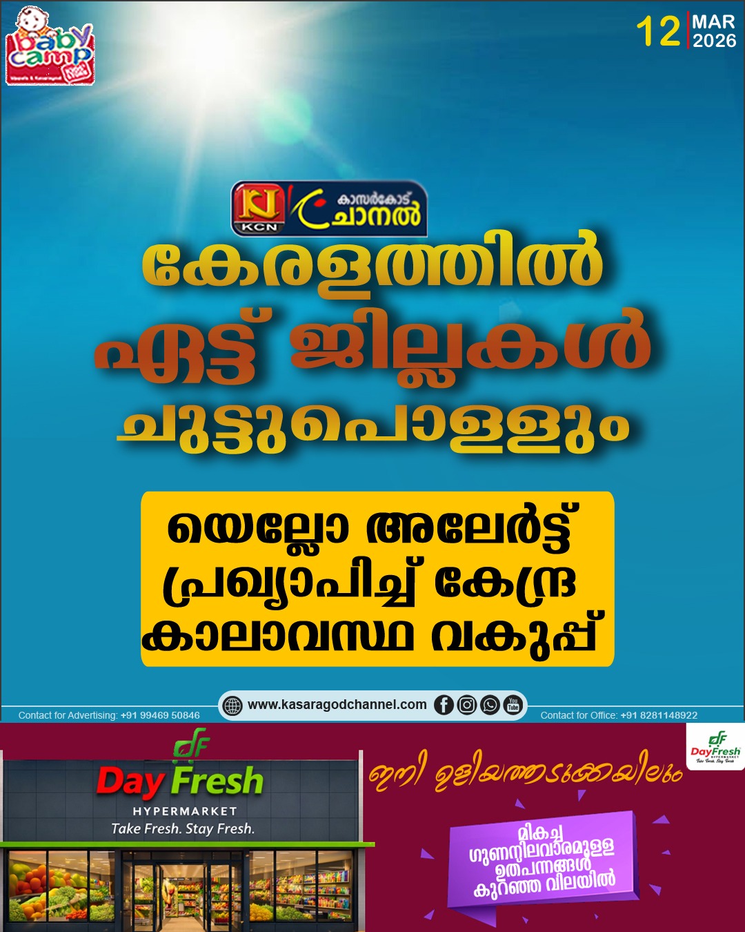 തിരുവനന്തപുരം: സംസ്ഥാനത്ത് കാലാവസ്ഥ മുന്നറിയിപ്പ് നല്കി കേന്ദ്ര കാലാവസ്ഥാ വകുപ്പ്. ചൂട് കൂടുന്ന സാഹചര്യത്തില് എട്ട് ജില്ലകളില് യെല്ലോ അലേര്ട്ട് പ്രഖ്യാപിച്ചു. കണ്ണൂര്, പാലക്കാട്, കാസര്കോഡ്, ആലപ്പുഴ, കോട്ടയം, തൃശ്ശൂര്, മലപ്പുറം, കോഴിക്കോട് ജില്ലകളിലാണ് നാളെ യെല്ലോ അലേര്ട്ട് പ്രഖ്യാപിച്ചത്. കണ്ണൂര് ജില്ലയില് താപനില 38 ഡിഗ്രി സെല്ഷ്യസ് വരെ ഉയരാമെന്ന് കാലാവസ്ഥ വകുപ്പ് അറിയിച്ചു. കൂടാതെ കാസര്കോഡ്. പാലക്കാട് ജില്ലകളില് താപനില 37 ഡിഗ്രി സെല്ഷ്യസ് വരെ ഉയരും.ഈ ജില്ലകളില് അസ്വസ്ഥതയുണ്ടാക്കുന്ന കാലാവസ്ഥയ്ക്ക് സാധ്യതയെന്നും കാലാവസ്ഥ വകുപ്പിന്റെ മുന്നറിയിപ്പില് വ്യക്തമാക്കിയിട്ടുണ്ട്.