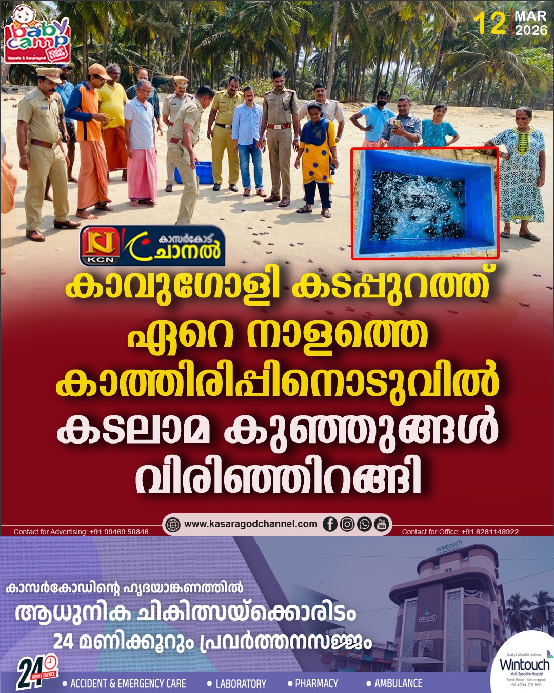 പരിസ്ഥിതി പ്രവര്ത്തകനും കാവുഗോളി കടപ്പുറത്തെ മത്സ്യത്തൊഴിലാളിയുമായ ശ്രീജയേഷ് ബിയുടെ നാളുകളായുള്ള പരിചരണത്തിന് ആശ്വാസത്തിന്റെ നെടുവീര്പ്പ്. വര്ഷങ്ങളായി ഈ സല്കര്മ്മം ചെയ്തുവരുന്ന ജയേഷിന്റെയും സുഹൃത്തുക്കളുടെയും സ്നേഹചൂടില് വിരിഞ്ഞ് കടലിലേക്ക് മടങ്ങിയ കടലാമ കുഞ്ഞുങ്ങള് നിരവധിയാണ്. മൊഗ്രാല് പുത്തൂര് ഗ്രാമപഞ്ചായത്ത് മെമ്പര് ശ്രീമതി മല്ലിക പ്രഭാകര്, ബേക്കല് കോസ്റ്റല് പോലീസ് സ്റ്റേഷന് ഇന്സ്പെക്ടര് ശ്രീ യൂസഫ് നടുത്തറമ്മല്,കാസര്ഗോഡ് സോഷ്യല് ഫോറസ്ട്രി, റേഞ്ച് ഫോറസ്റ്റ് ഓഫീസര് ശ്രീ കെ ഗിരീഷ് എന്നിവരുടെ നേതൃത്വത്തില് കോസ്റ്റല് പോലീസ് സ്റ്റേഷനിലെയും ഫോറസ്ട്രി ഡിപ്പാര്ട്ട്മെന്റിലെയും ഉദ്യോഗസ്ഥരും മത്സ്യത്തൊഴിലാളികളും നാട്ടുകാരും ചേര്ന്ന് കടലാമ കുഞ്ഞുങ്ങളെ കടലിലേക്ക് യാത്രയാക്കി