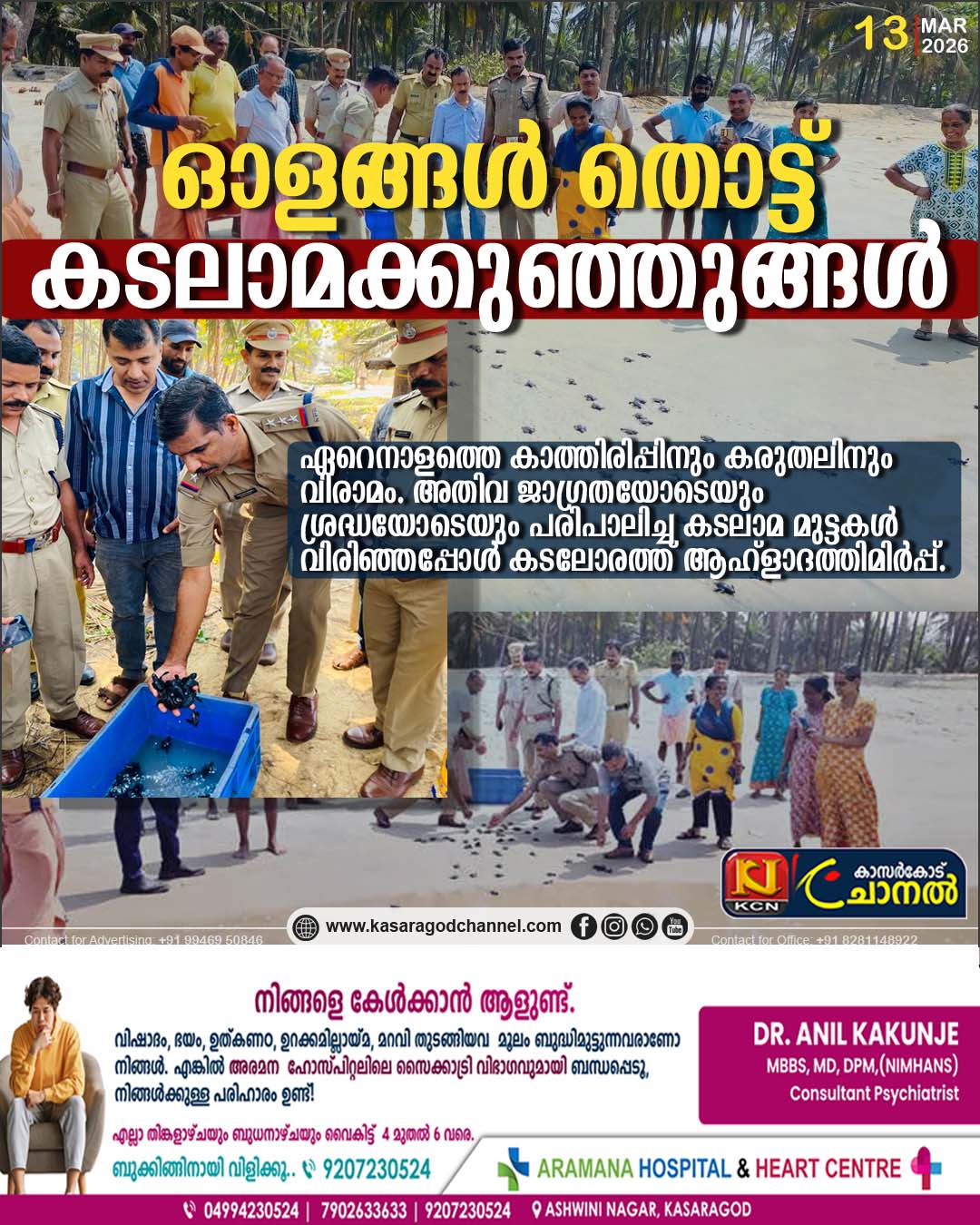 വിരാമം. അതിവ ജാഗ്രതയോടെയും ശ്രദ്ധയോടെയും പരിപാലിച്ച കടലാമ മുട്ടകള് വിരിഞ്ഞപ്പോള് കടലോരത്ത് ആഹ്ളാദത്തിമിര്പ്പ്. മൊഗ്രാല്പുത്തൂരിലെ കാവുഗോളി കടപ്പുറത്ത് കണ്ടെത്തി വിരിയെച്ചെടുത്ത 95 ഒലിവ് റിഡ്ലി ഇനത്തില്പ്പെട്ട കടലാമക്കുഞ്ഞുങ്ങളെയാണ് വ്യാഴാഴ്ച കടലിലേക്ക് വിട്ടയച്ചത്. കാവുഗോളിയിലെ കടലാമസംരക്ഷണ പ്രവര്ത്തകരായ ബി.കെ. ജയേഷ്, വേദ പ്രകാശ് എന്നിവരാണ് മുട്ടകള് കണ്ടെത്തുന്നതും ഒരു പോറലുമേല്ക്കാതെ അവ സംരക്ഷിക്കുന്നതും. ഒലിവ് റിഡ്ലി വിഭാഗത്തില്പ്പെട്ട കടലാമകളാണ് ഡിസംബര്, ജനുവരി മാസങ്ങളില് നല്ല നിലാവുള്ള രാത്രികളില് മുട്ടയിടാനായി കാവുഗോളിയുടെ തീരത്തെത്തുന്നത്.