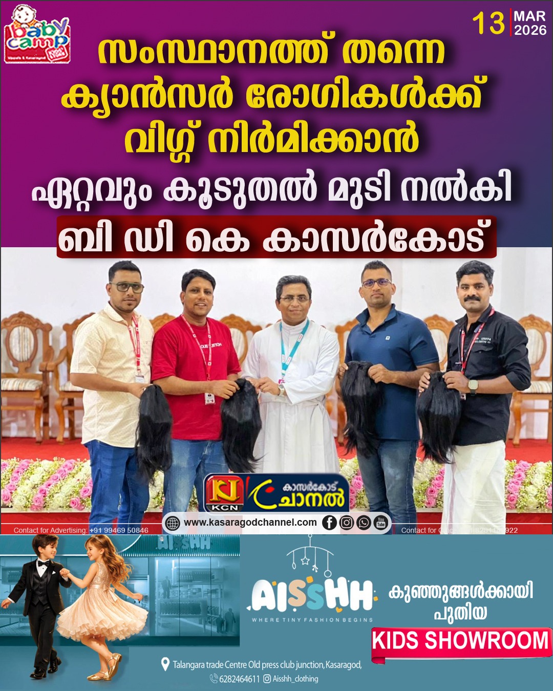 സംസ്ഥാനത്ത് തന്നെ ക്യാന്സര് രോഗികള്ക്ക് വിഗ്ഗ് നിര്മിക്കാന് ഏറ്റവും കൂടുതല് മുടി നല്കി ബി ഡി കെ കാസര്ഗോഡ്