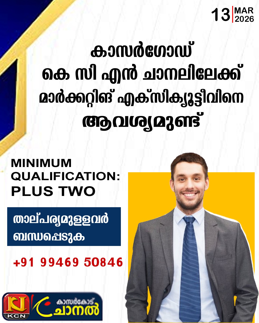 കാസര്ഗോഡ് കെ സി എന് ചാനലിലേക്ക് മാര്ക്കെറ്റിങ് എക്സിക്യൂട്ടീവിനെ ആവശ്യമുണ്ട്.By kcnchannel / March 13, 2026 MINIMUM QUALIFICATION: PLUS TWO താല്പര്യമുള്ളവര് ബന്ധപ്പെടുക +91 99469 50846