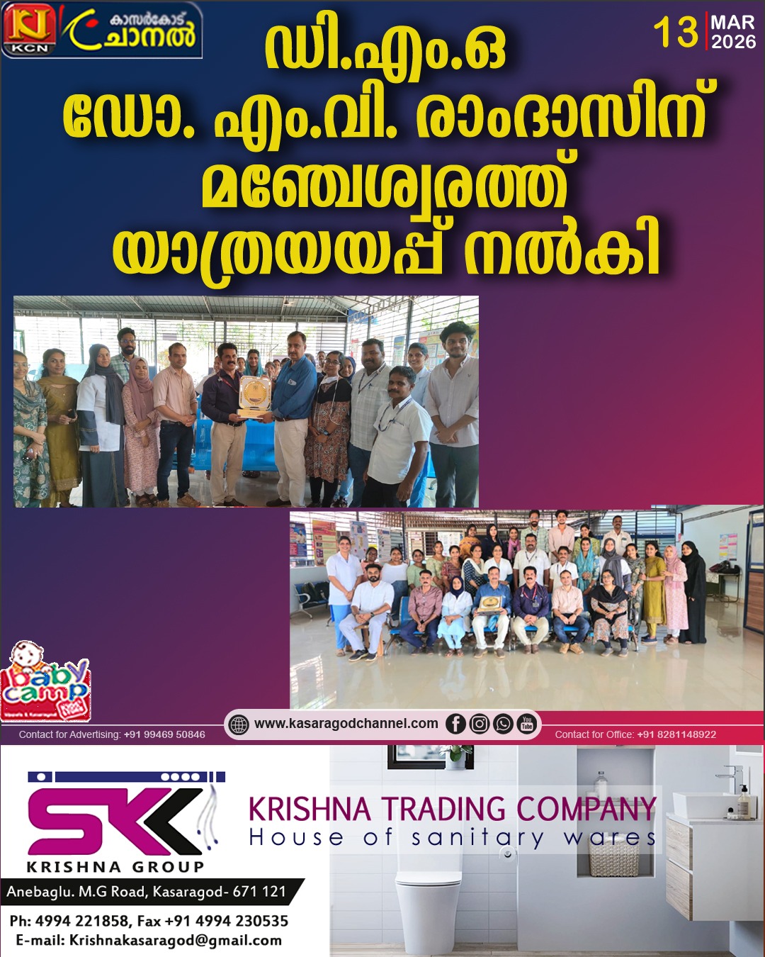 ?ബ്ലോക്ക് ഫാമിലി ഹെല്ത്ത് സെന്റര് ഹാളില് നടന്ന ചടങ്ങ് മെഡിക്കല് ഓഫീസര് പ്രഭാകര് റൈ ഉദ്ഘാടനം ചെയ്തു. ആരോഗ്യ മേഖലയില് ഡോ. രാംദാസ് നല്കിയ മികച്ച സേവനങ്ങളെയും മാതൃകാപരമായ പ്രവര്ത്തനങ്ങളെയും അദ്ദേഹം പ്രസംഗത്തില് പ്രശംസിച്ചു. ജില്ലയിലെ ആരോഗ്യരംഗത്തെ അടിസ്ഥാന സൗകര്യങ്ങള് മെച്ചപ്പെടുത്തുന്നതിനും പകര്ച്ചവ്യാധി പ്രതിരോധ പ്രവര്ത്തനങ്ങള് ഏകോപിപ്പിക്കുന്നതിനും അദ്ദേഹം നല്കിയ നേതൃത്വം ഏറെ ശ്രദ്ധേയമായിരുന്നുവെന്ന് അദ്ദേഹം കൂട്ടിച്ചേര്ത്തു.