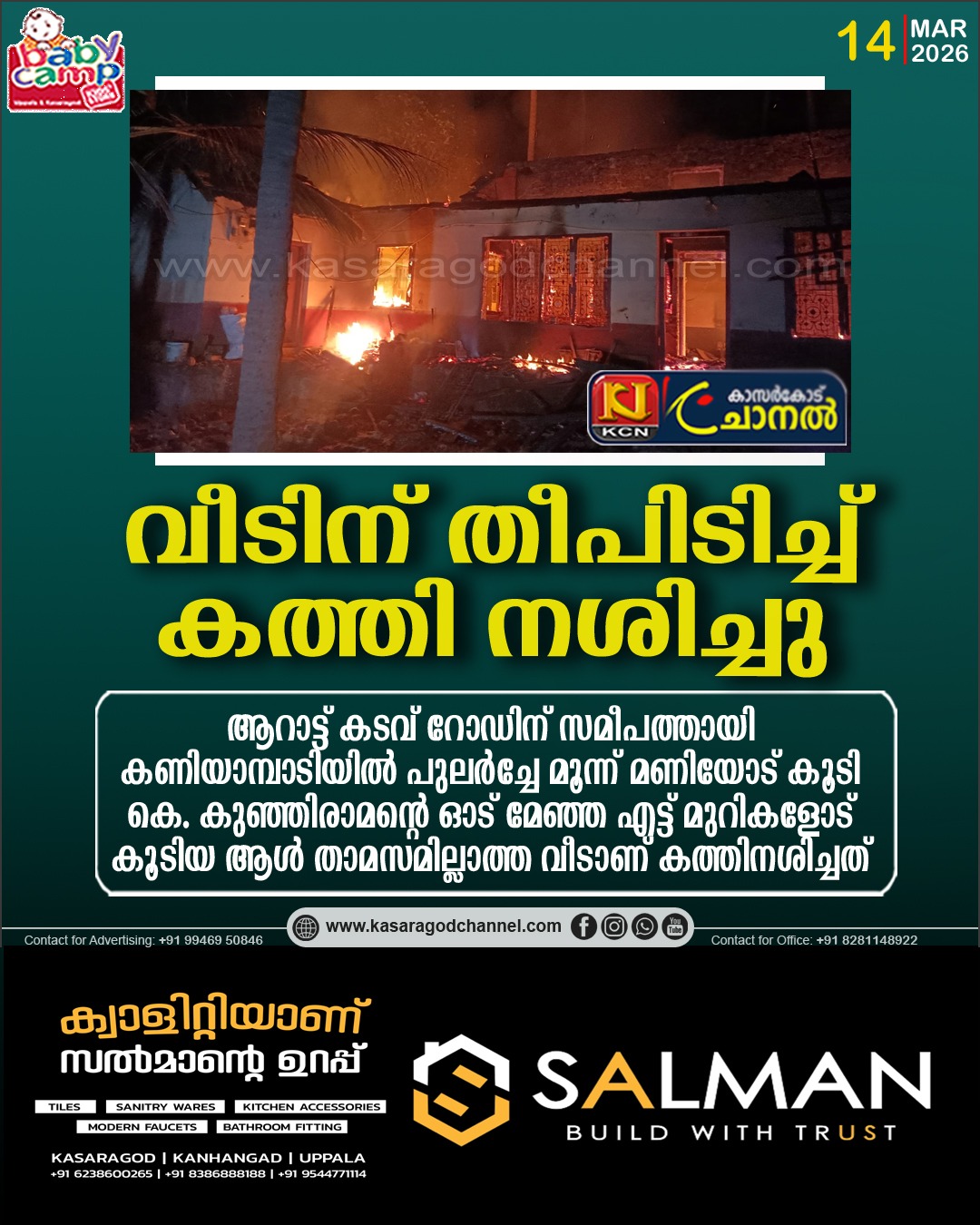 ഉദുമ ,പാലക്കുന്ന്: ആറാട്ട് കടവ് റോഡിന് സമീപത്തായി കണിയാമ്പാടിയില് പുലര്ച്ചേ മൂന്ന് മണിയോട് കൂടി കെ. കുഞ്ഞിരാമന്റെ ഓട് മേഞ്ഞ എട്ട് മുറികളോട് കൂടിയ ആള് താമസമില്ലാത്ത വീടാണ് കത്തിനശിച്ചത്. വീട്ടുകാര് തൃക്കണ്ണാട് അമ്പലത്തില് പോയി രാത്രി ഒരു മണിയോട് കൂടിയാണ് വീട്ടിലെത്തിയത്. പുലര്ച്ചേ മൂന്ന് മണിയോട് കൂടി അയല്വാസി ഹരി എന്നയാള് ആണ് വീടിന് തീപിടിച്ചത് ശ്രദ്ധയില്പ്പെട്ടത് ഉടനെ കുഞ്ഞിരാമനെ ഫോണില് വിളിക്കുകയും എന്നാല് ഫോണ് എടുക്കാത്തതിനാല് നേരിട്ട് വീട്ടിലെത്തി വീട്ടുക്കാരെ വിളിച്ചുണര്ത്തി അറിയിക്കുകയായിരുന്നു. ഉടനെ കാസര്ഗോഡ് അഗ്നി രക്ഷാസേനയെ വിവരം അറിയിക്കുകയും, സീനിയര് ഫയര് & റെസ്ക്യൂ ഓഫീസര് വി.എന്.വേണുഗോപാലിന്റെ നേതൃത്വത്തില് രണ്ട് യൂണിറ്റ് വാഹനം എത്തി രണ്ടു മണിക്കൂര് ശ്രമഫലമായാണ് തീ പൂര്ണ്ണമായും അണയ്ക്കാന് കഴിഞ്ഞത് മേല്ക്കൂര പൂര്ണ്ണമായും കത്തി അമര്ന്നിരുന്നു.