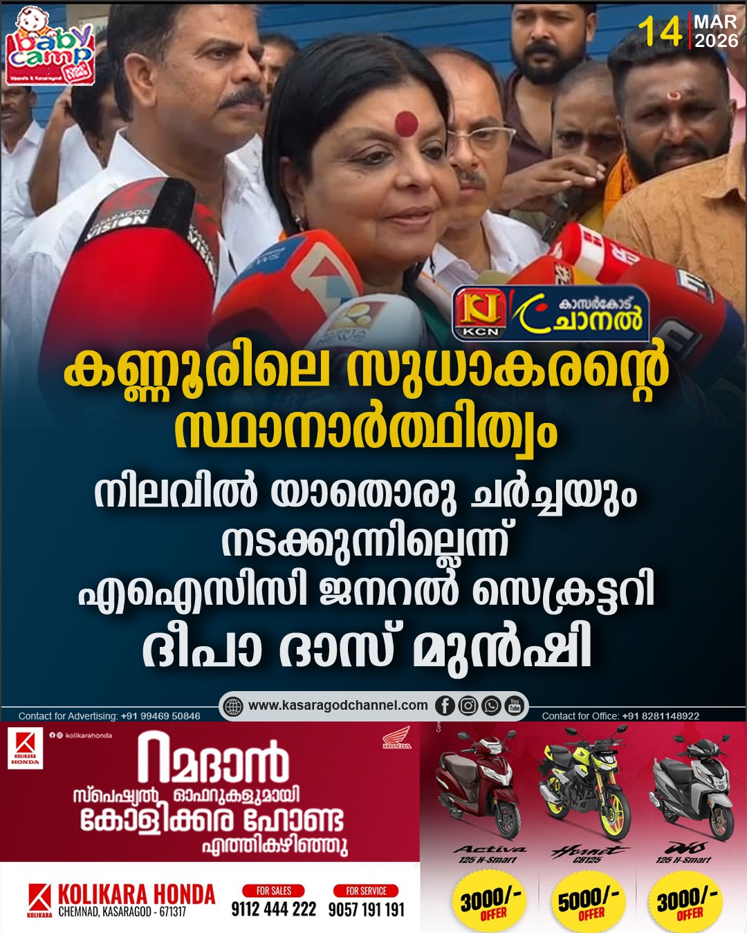 സുധാകരന് കണ്ണൂരിന്റെ മാത്രമല്ല കേരളത്തിലെ തന്നെ കരുത്തുറ്റ നേതാവാണെന്നും അവര് കാസര്കോട്ട് പറഞ്ഞു.