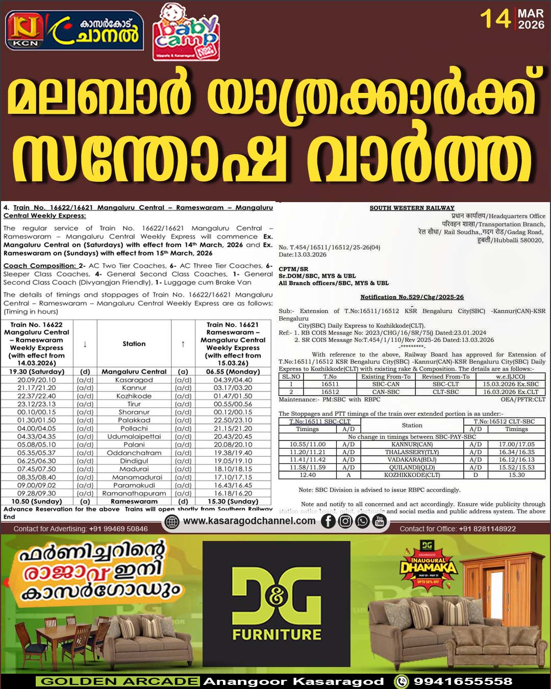 ബാംഗ്ലൂര് – മംഗളൂരു – കണ്ണൂര് എക്സ്പ്രസ് കോഴിക്കോട്ടേക്ക് നീട്ടി.15 മാര്ച്ച് മുതല് ബാംഗ്ലൂര് നിന്നും.16 മാര്ച്ച് മുതല് കോഴിക്കോട് നിന്നും പുതിയ സമയക്രമം ബാധകമാകും.