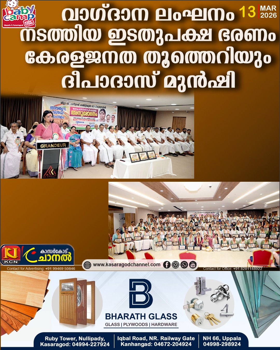ജില്ലാ കോണ്ഗ്രസ്സ് കമ്മിറ്റിയുടെ നേതൃത്വത്തില് കാസര്ഗോഡ് പുതിയ ബസ്റ്റാന്റ് പരിസരത്തുള്ള ആര്.കെ മാള് ഓഡിറ്റോറിയത്തില് സംഘടിപ്പിച്ച തദ്ദേശ സ്വയംഭരണ സ്ഥാപനങ്ങളിലേക്ക് നടന്ന തെരഞ്ഞെടുപ്പില് വിജയിച്ച കോണ്ഗ്രസ്സ് ജന പ്രതിനിധികള്ക്ക് നല്കിയ അനുമോദന പരിപാടി ‘ത്രിവര്ണ്ണ വിജയ സംഗമം’ ഉദ്ഘാടനം ചെയ്ത് സംസാരിക്കുകയായിരുന്നു ദീപാദാസ് മുന്ഷി. ഡിസിസി പ്രസിഡണ്ട് പി.കെ ഫൈസല് അദ്ധ്യക്ഷത വഹിച്ചു. രാജ്മോഹന് ഉണ്ണിത്താന് എം.പി മുഖ്യപ്രഭാഷണം നടത്തി. ഡിസിസി ജനറല് സെക്രട്ടറി എം. സി പ്രഭാകരന് സ്വാഗതം പറഞ്ഞു. കെപിസിസി ജനറല് സെക്രട്ടറിമാരായ കെ. നീലകണ്ഠന്, ഹക്കീം കുന്നില്, യുഡിഎഫ് ജില്ലാ കണ്വീനര് എ. ഗോവിന്ദന് നായര്, സേവാദള് സംസ്ഥാന ചെയര്മാന് രമേശന് കരുവാച്ചേരി, നേതാക്കളായ പി.ജി ദേവ്, സാജിദ് മൗവ്വല്, ബി.പി പ്രദീപ് കുമാര്, മീനാക്ഷി ബാലകൃഷ്ണന്, സോമശേഖര ഷേണി, അഡ്വ: പി. വി സുരേഷ്, കെ. പി പ്രകാശന്, ടോമി പ്ലാച്ചേരി, ഹരീഷ് പി നായര്, ഗീത കൃഷ്ണന്, ധന്യാ സുരേഷ്, സി. വി ജെയിംസ്, പി. കുഞ്ഞിക്കണ്ണന്, സി. രാജന്, കെ ഖാലിദ്, കെ. ലക്ഷ്മണ പ്രഭു, തോമസ് മാത്യു, കെ. വാരിജാക്ഷന്, രാജു കട്ടക്കയം, കെ. വി വിജയന്, ജോയ് ജോസഫ്, ഉമേശന് വേളൂര്, മധുസൂദനന് ബാലൂര്, കെ. വി ഭക്തവത്സലന്, ലോകനാഥ് ഷെട്ടി, വി. ഗോപകുമാര്, കെ. ആര് കാര്ത്തികേയന്, ജവാദ് പുത്തൂര്, എം. വി ഉദ്ദേശ് കുമാര്, ജോമോന് ജോസ്, കെ.കെ ബാബു, ആര്. ഗംഗാധരന്, അര്ജുനന് തായലങ്ങാടി എന്നിവര് സംസാരിച്ചു.