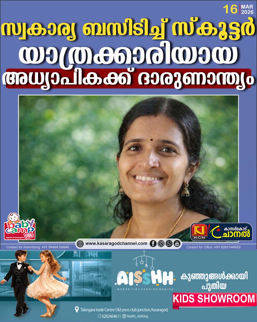 സ്വകാര്യ ബസിടിച്ച് സ്കൂട്ടര് യാത്രക്കാരിയായ അധ്യാപികക്ക് ദാരുണാന്ത്യം