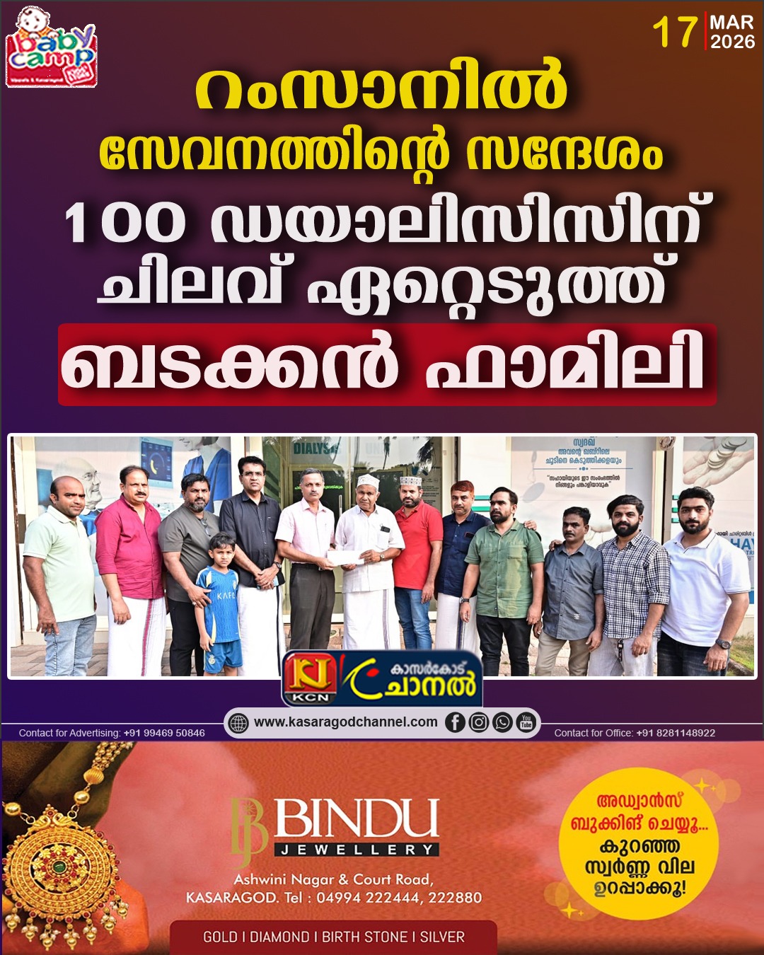 പരിശുദ്ധ റംസാന് മാസത്തോടനുബന്ധിച്ച് ഡയാലിസിസ് സെന്ററിന്റെ ധനസമാഹരണ പദ്ധതിയില് പങ്കാളികളായി 100 ഡയാലിസിസിനാവശ്യമായ മുഴുവന് ചിലവും ഏറ്റെടുത്താണ് ബടക്കന് ഫാമിലി മാതൃകാപരമായ ഈ കാരുണ്യ പ്രവര്ത്തനം നടത്തിയത്.