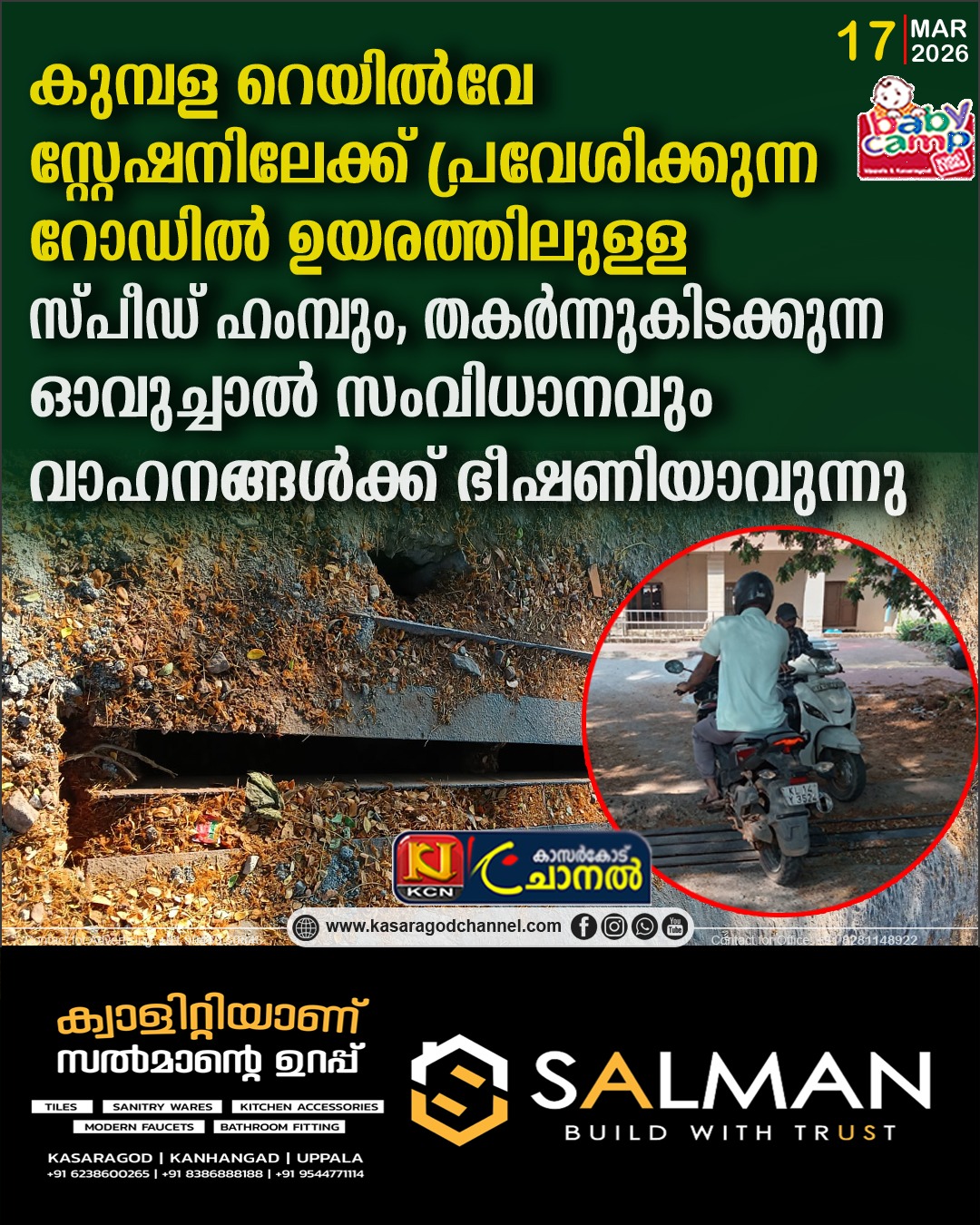 ഫോട്ടോ:കുമ്പള റെയില്വേ സ്റ്റേഷന് മുന്വശം വാഹനങ്ങളൊക്കെ തടസ്സമായി നില്ക്കുന്ന ഹംമ്പും തകര്ന്നുകിടക്കുന്ന ഡ്രൈനേജ് സംവിധാനവും.