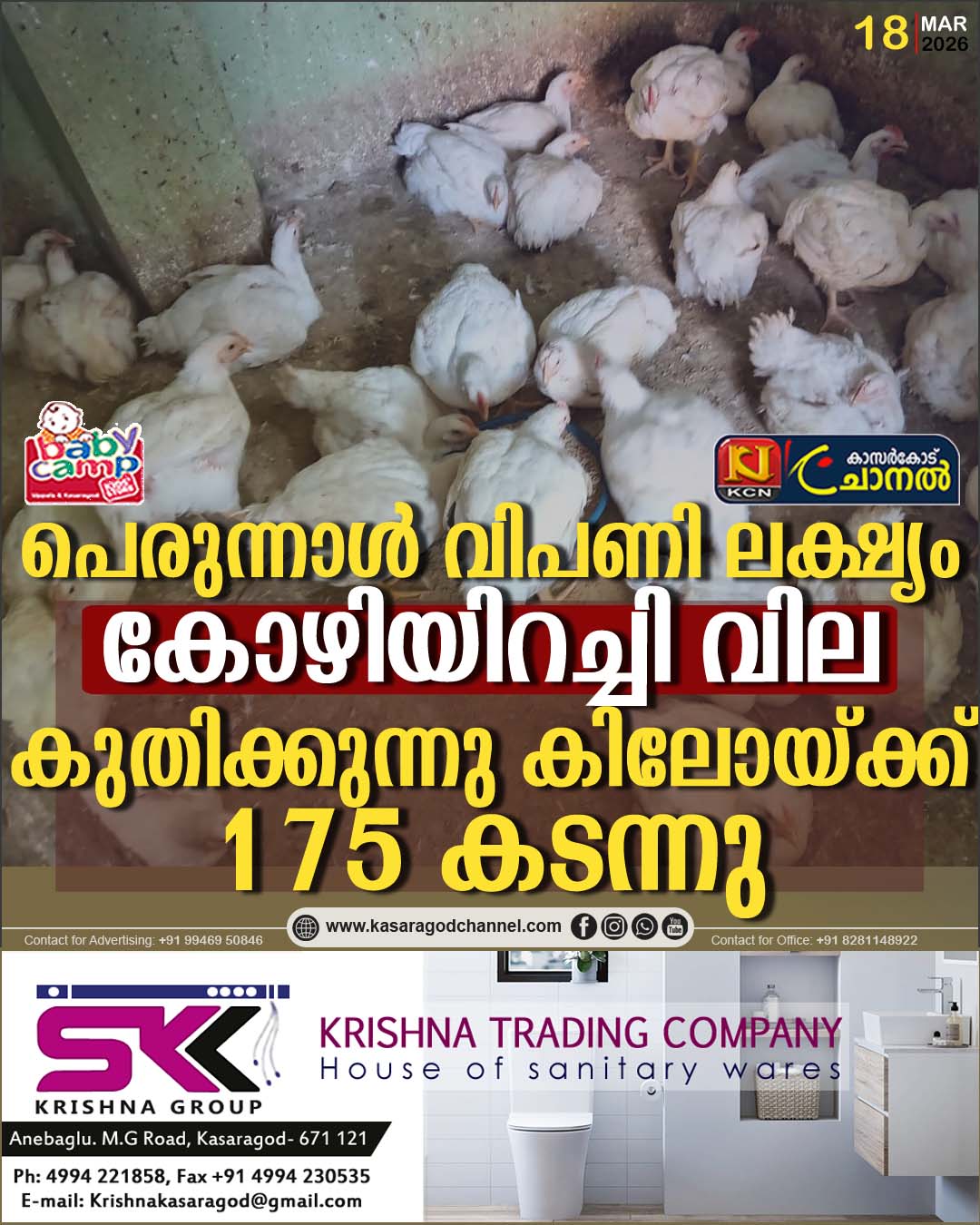 കാസര്ഗോഡ്, മൊഗ്രാല്പുത്തൂര്, കുമ്പള,മൊഗ്രാല്, ആരിക്കാടി എന്നിവിടങ്ങളിലൊക്കെ 170മുതല് 180 രൂപയാണ് വില. ചിലയിടങ്ങളില് കച്ചവടം പിടിക്കാന് കോഴിക്കട ഉടമകള് ഫാമുകളില് നിന്ന് നേരിട്ട് കോഴി ഇറക്കി വിലകുറച്ച് നല്കുന്നുണ്ട്.